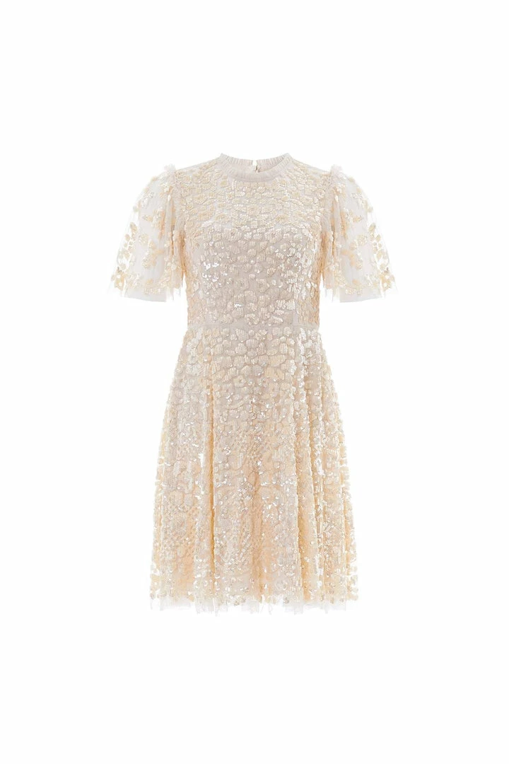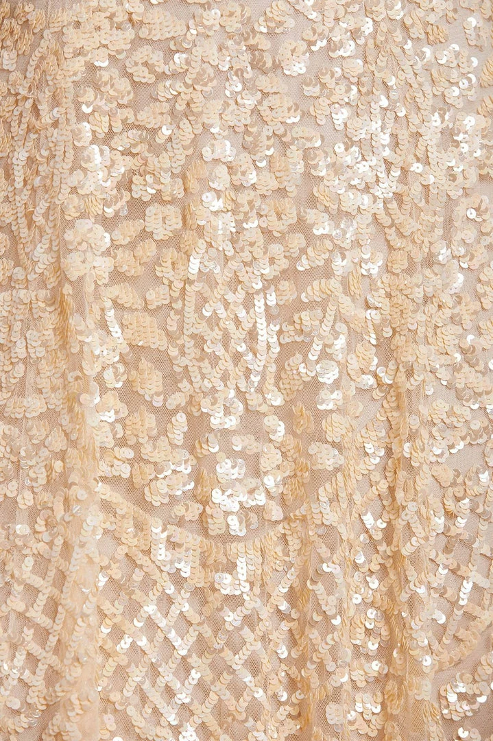 The Amalie Sequin Mini Dress in Champagne. Decorated with intricate shimmering sequins and floral motifs, this short-sleeved dress is designed with a layered tulle skirt featuring ‘x’ motifs throughout, adding subtle texture. Make this your new season go-to.