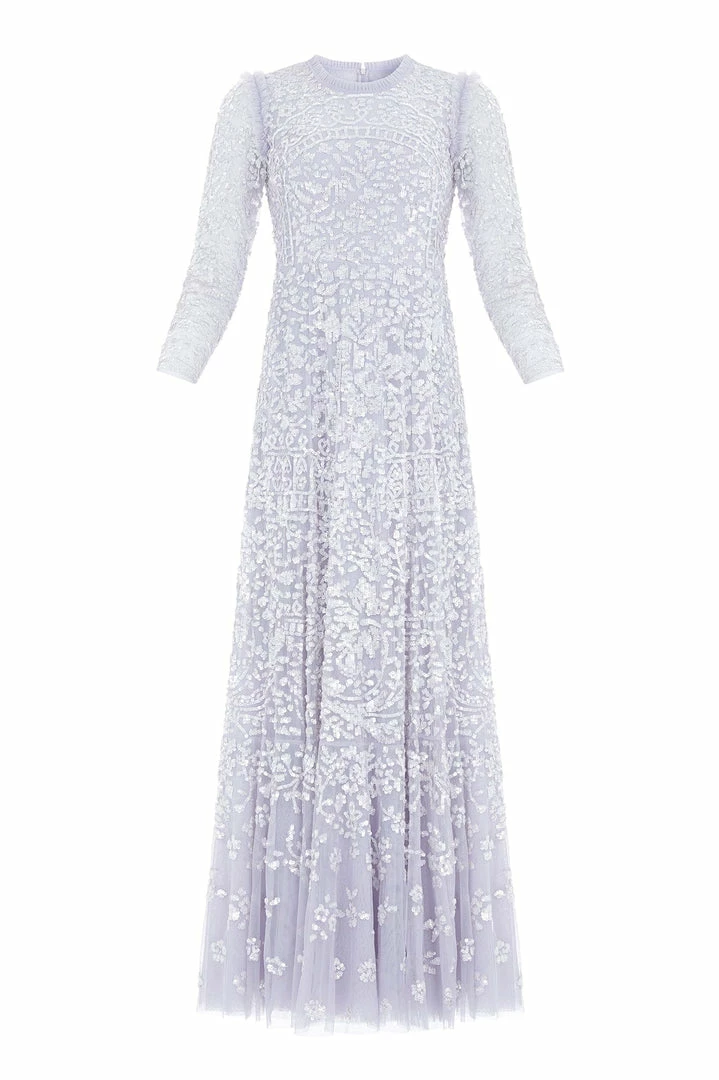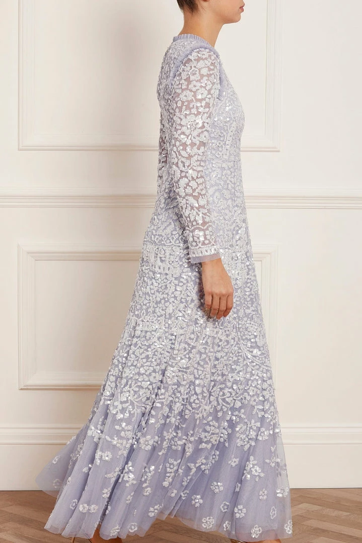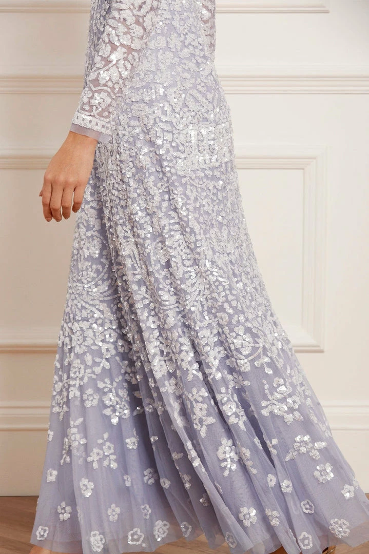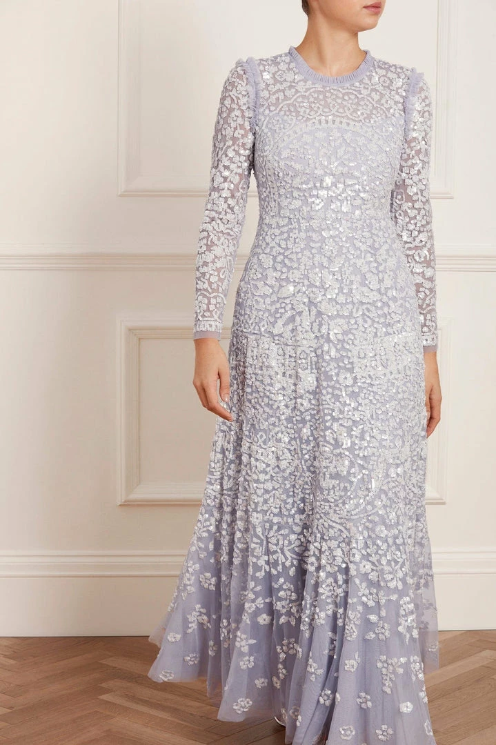 NEW SEASON. The Amaryllis Gown in Porcelain Blue/White. This embellished gown has a fluid floral artwork design with shimmering white sequins. Beautifully crafted with tulle details and a voluminous skirt to create added movement as you walk. Make a statement in the Amaryllis at your next event.