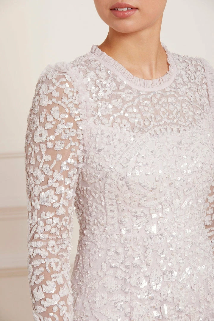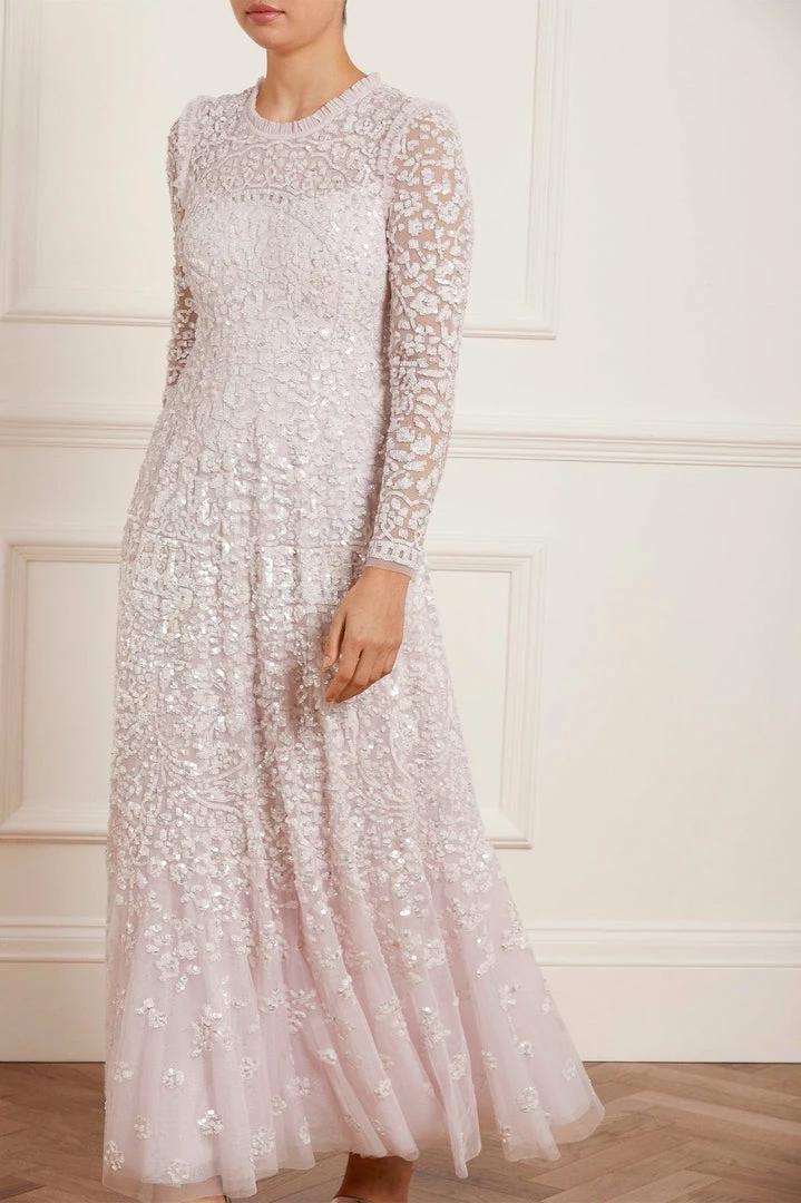 NEW SEASON. The Amaryllis Gown in Powder Pink/White. This embellished gown has a fluid floral artwork design with shimmering white sequins. Beautifully crafted with tulle details and a voluminous skirt to create added movement as you walk. Make a statement in the Amaryllis at your next event.