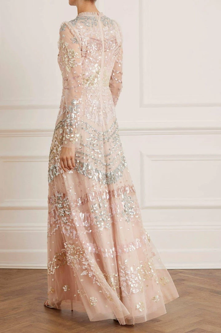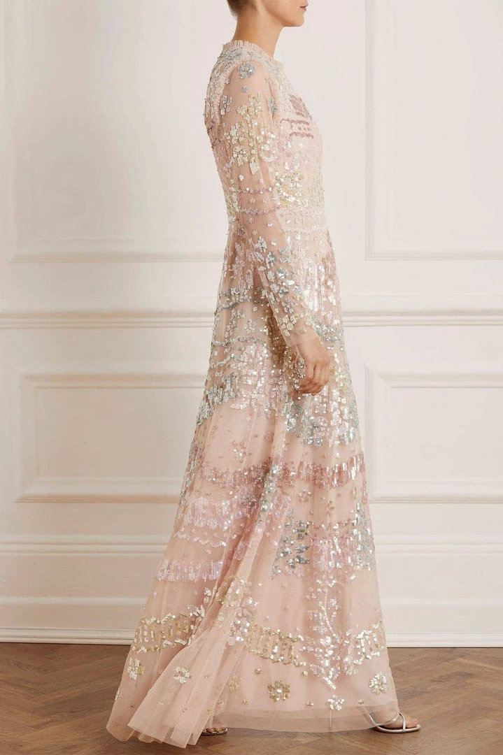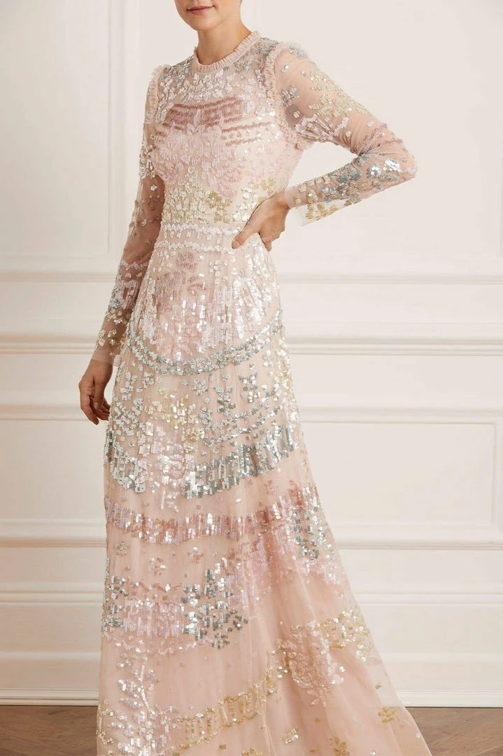 The Angeline Sequin Gown in Pearl Rose / Multi. This eye-catching gown is decorated with muted rainbow shimmering sequins in green, blue and pink. Inspired by a vintage floral lace artwork with horizontal highlights. The Angeline has long sleeves with pretty floral elements, engineered to flatter the A-line silhouette. There is delicate frill lace detailing around the neck and arm for further intrigue. Make an entrance in this showstopping dress.