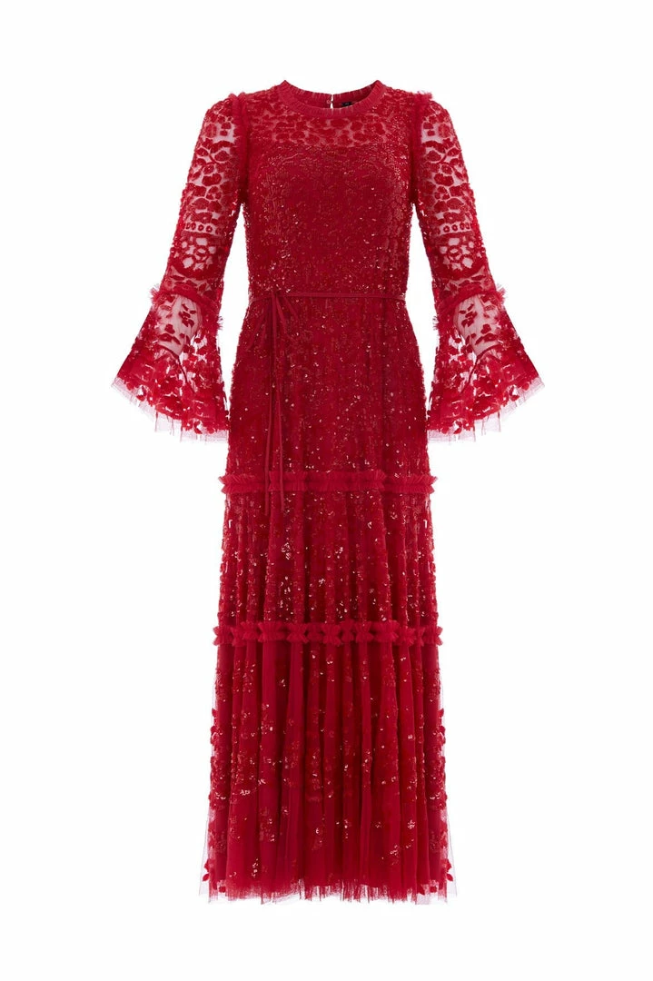 NEEDLE & THREAD EXCLUSIVE. The Annie Sequin Tiered Ankle Gown in Deep Red. Adorned with shimmering sequins in a floral and bow artwork, this gown is inspired by a lace tablecloth. Designed with a loose fit silhouette and tiered throughout, creating beautiful movement. Make an effortless statement.