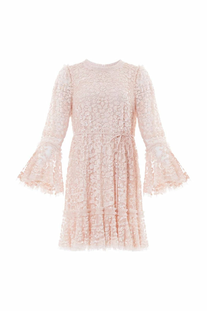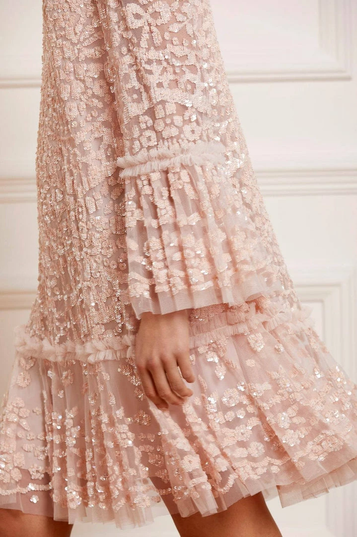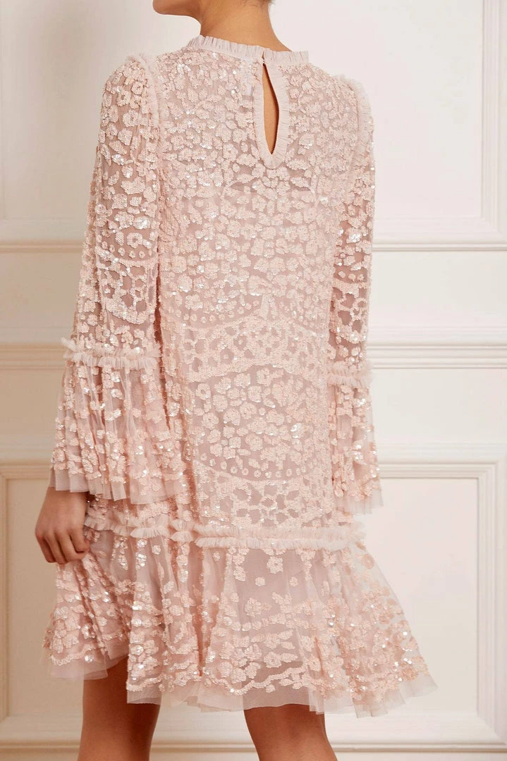The Annie Sequin Tiered Mini Dress in Petal Pink. Adorned with shimmering sequins in a floral and bow artwork, this mini dress is inspired by a lace tablecloth. Designed with a loose fit silhouette and tiered throughout, creating beautiful movement. Make an effortless statement.