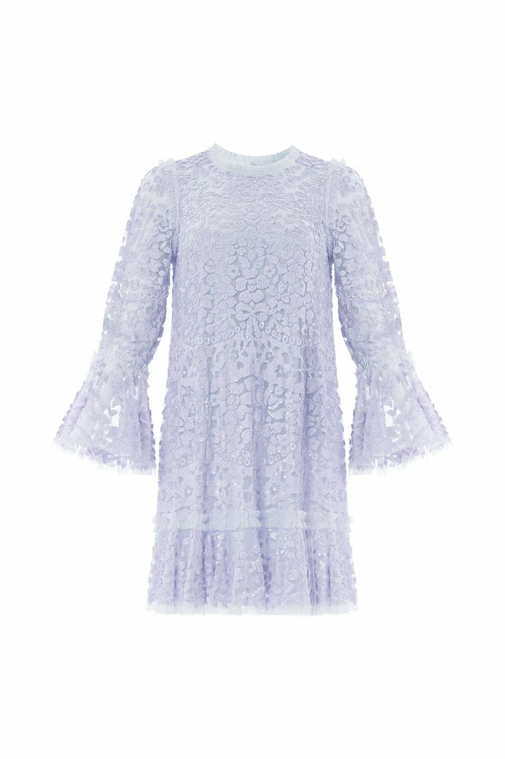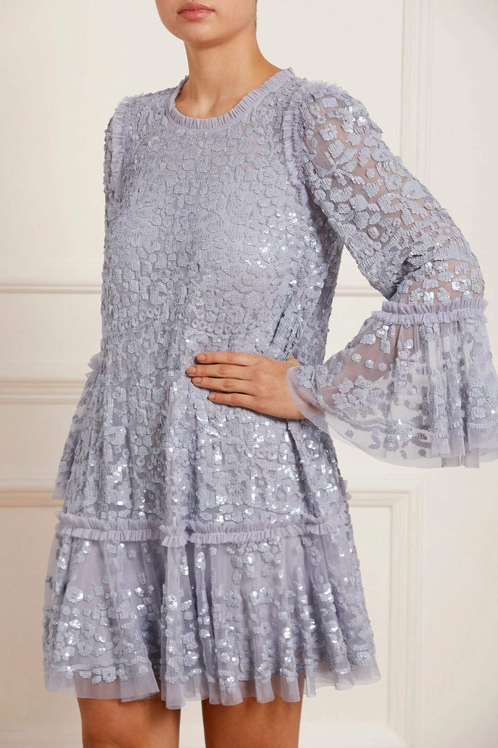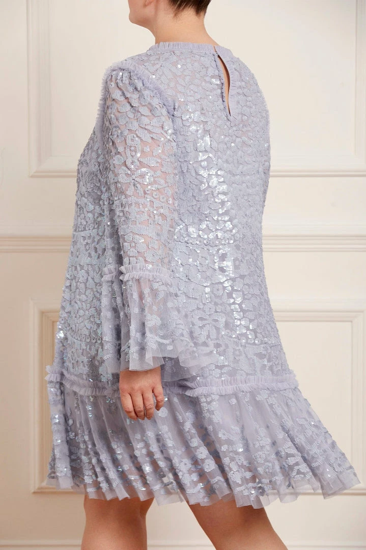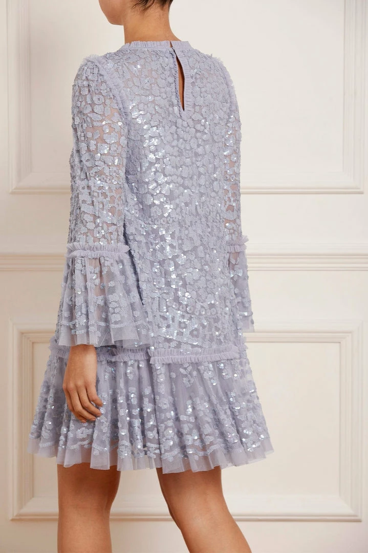 NEW SEASON. The Annie Sequin Tiered Mini Dress in Porcelain Blue. Inspired by a vintage lace tablecloth, this dress is adorned with tonal shimmering sequins in a floral and bow artwork. Designed with a relaxed fitting silhouette and tiered throughout, creating beautiful movement. The Annie mini can be worn with or without the waist tie to accentuate the figure. Make an effortless statement in this stunning dress.