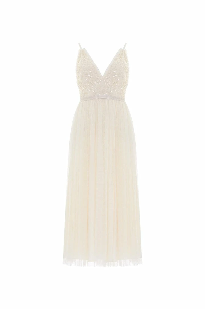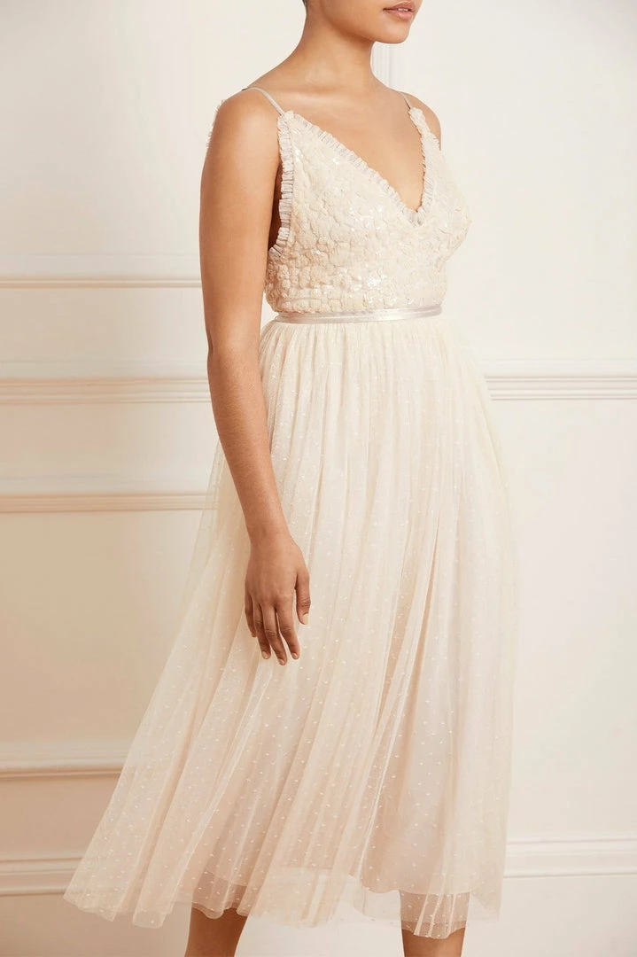 The Aurelia Bodice Cami Ballerina Dress in Champagne. This Needle & Thread signature style is beautifully designed with floral lace artwork inspired by a vintage tablecloth. Adorned with shimmering sequins on the bodice gently flowing into a soft tulle skirt. Make an entrance in the Aurelia.