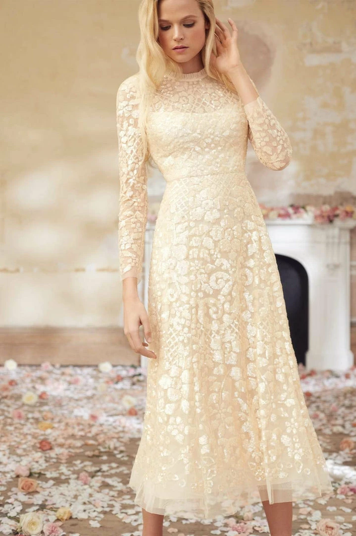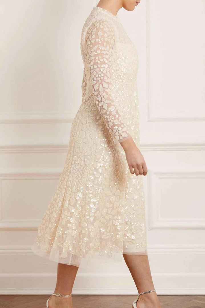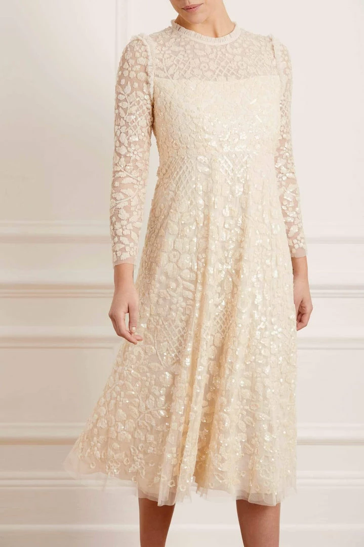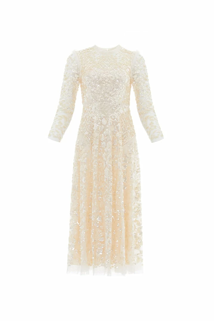 The Aurelia Long Sleeve Ballerina Dress in Champagne. Beautifully designed with floral lace artwork, inspired by a vintage lace tablecloth. This ballerina-length dress is decorated with shimmering sequins in pretty, soft tones. Romantically developed with long sleeves and playful, feminine detailing. Ensure all eyes are on you in the Aurelia.