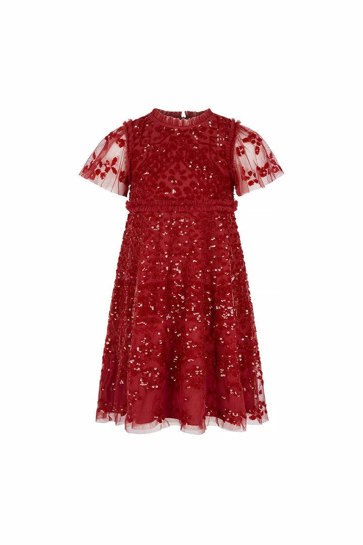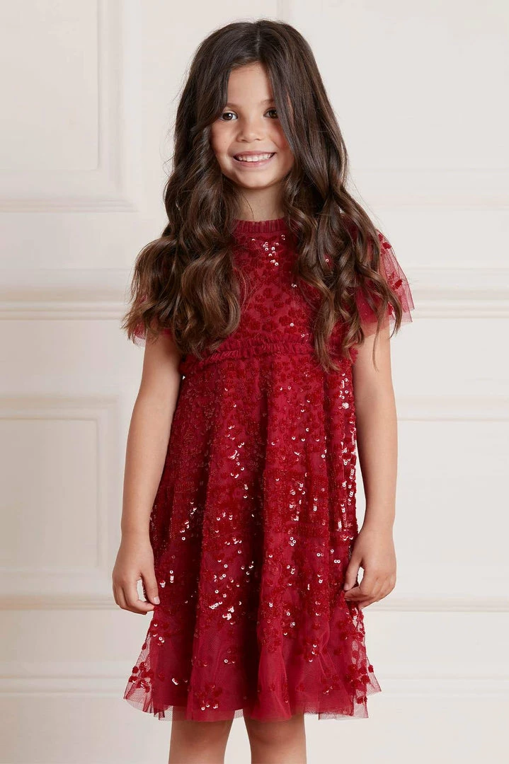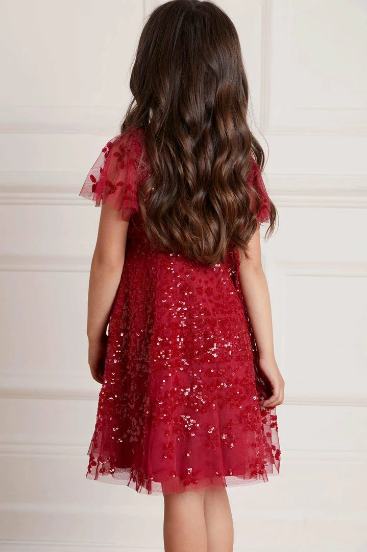 The Aurora KIDS Dress in Cherry Red. This light-catching dress is decorated with red shimmering sequins, inspired by a vintage lace tablecloth. This dress is crafted with short cap sleeves and pretty floral elements. Update your little one’s wardrobe with the ultimate fairytale dress of the season.