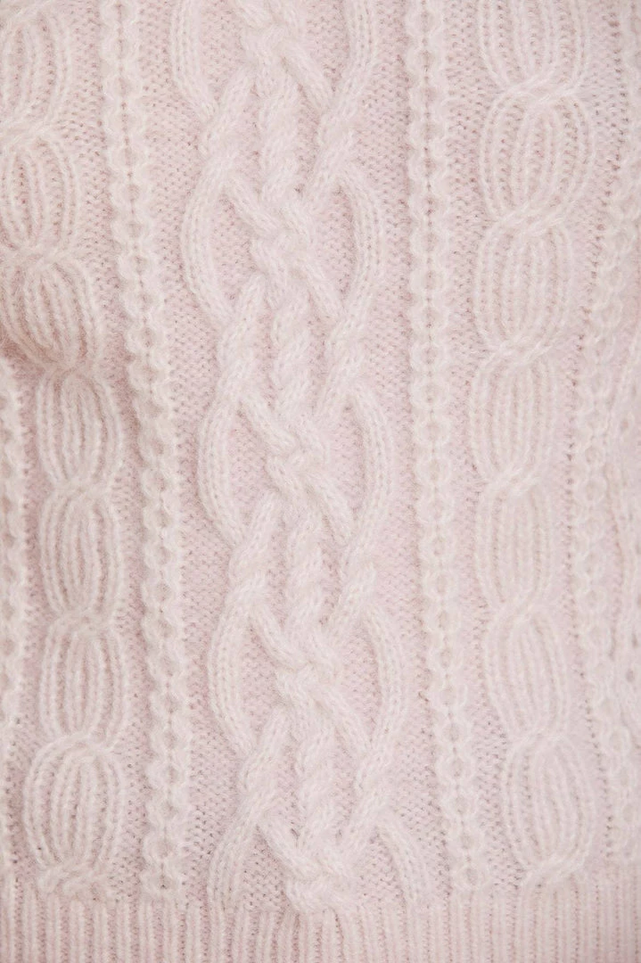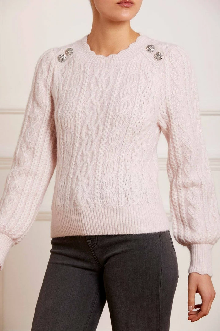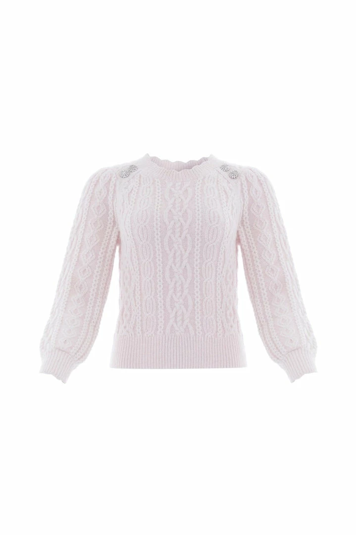 NEEDLE & THREAD EXCLUSIVE. The Cable Jewelled Button Midline Jumper in Light Pink / Champagne. This sweater is crafted from soft alpaca yarn, resulting in a cosy, fluffy texture. Decorated beautifully with intricate cable stitches contrasted in pink and champagne tones. Designed with a slim fit, crystal buttons and scallop detailing. A new Needle & Thread favourite.