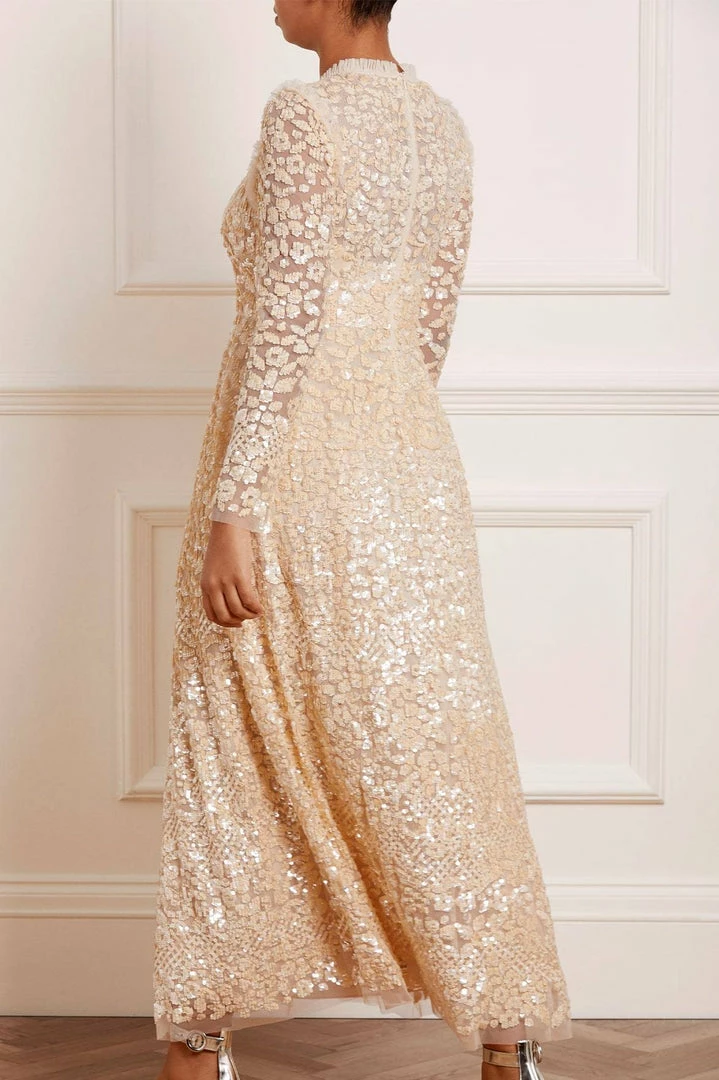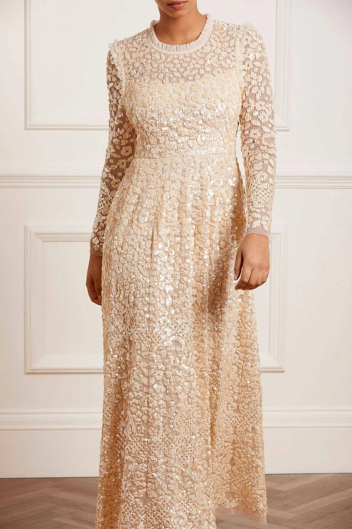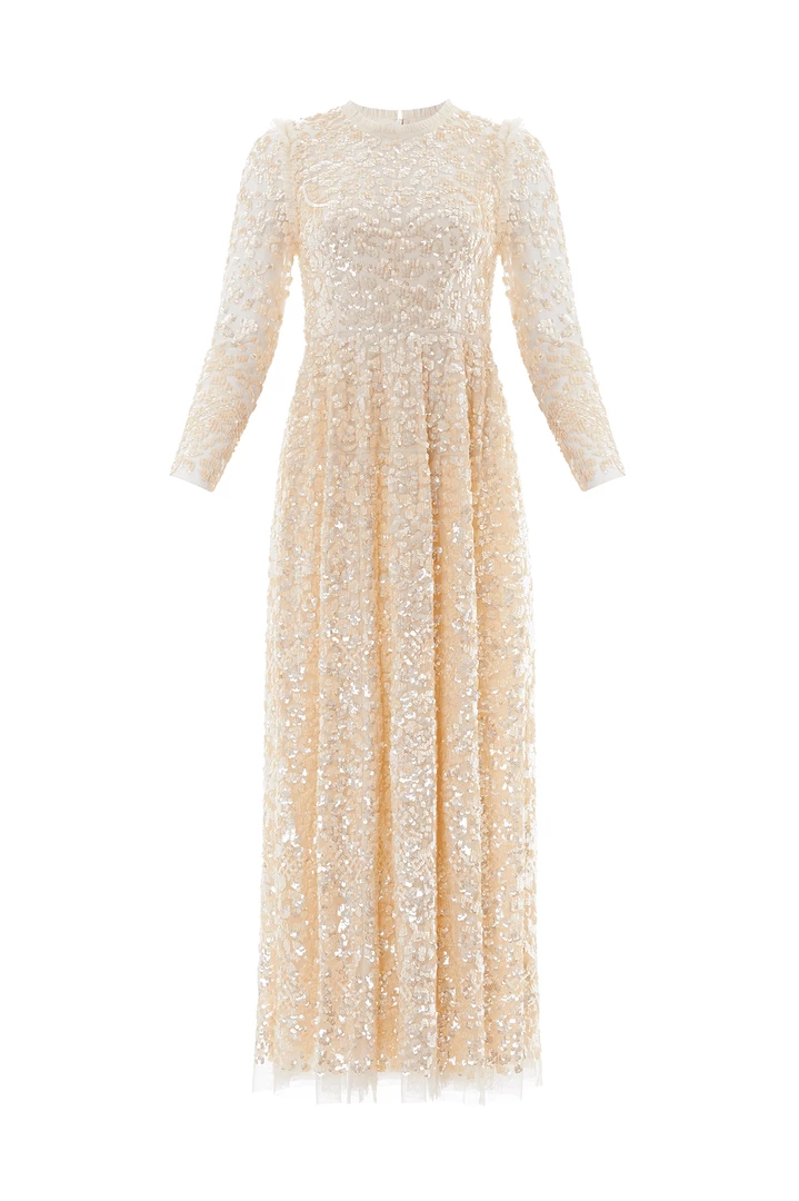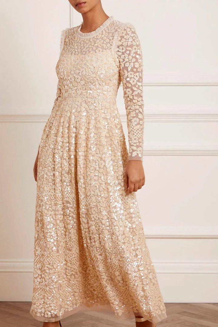 NEEDLE & THREAD EXCLUSIVE. The Floral Daze Sequin Ankle Gown in Champagne. A beautiful new silhouette for the season ahead. This ankle gown is densely decorated with shimmering sequins inspired by a floral lace tablecloth. Exquisitely designed with a layered, soft net to hold this flattering shape. A truly special piece.