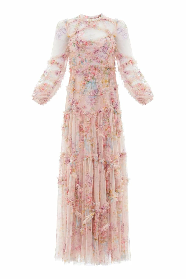 NEW SEASON. Floral Diamond Ruffle Gown in Topaz Pink. This eye catching piece is crafted from delicate ruffled tulle with an all over vintage print taken from an early 1900’s hand painted fabric design. A romantic look featuring voluminous cuffed sleeves and a flattering skirt that skims the body to gently increase in fullness, creating stunning movement within the tulle. This Victorian inspired look with a contemporary edge will be the star of your wardrobe.