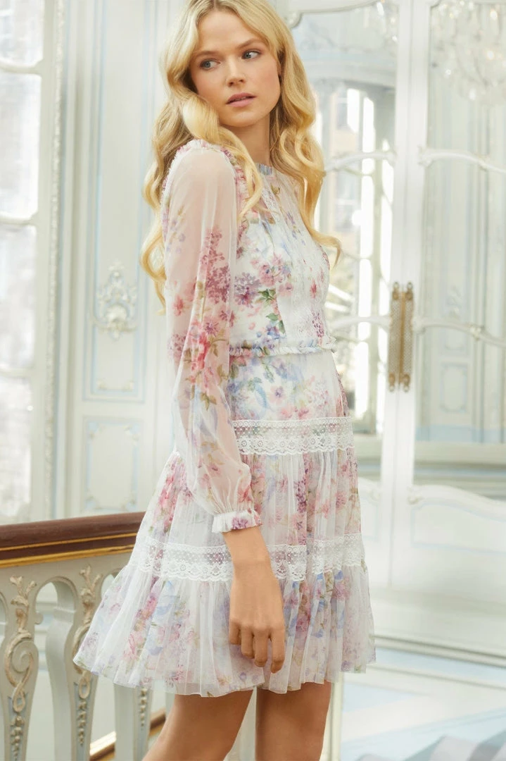 – Floral printed tulle decorated with lace trims and printed tulle frills