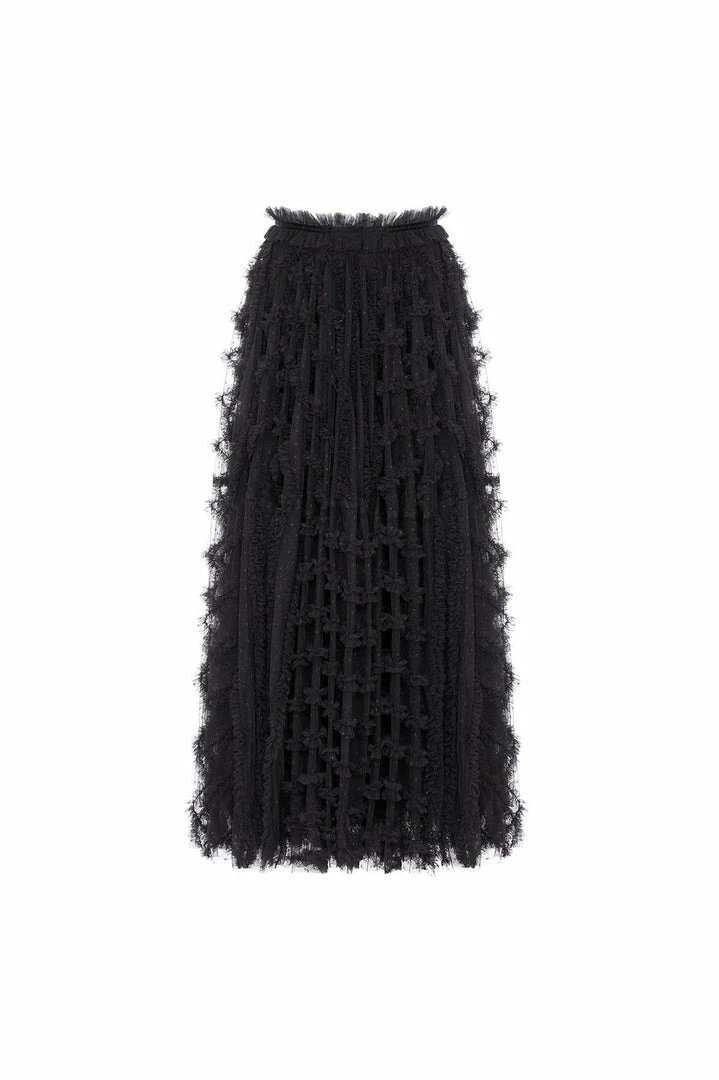 NEEDLE & THREAD EXCLUSIVE. The Florence Ruffle Ankle Skirt in Graphite. This beautiful skirt is crafted with layers of tulle, creating a voluminous romantic look. The ankle-length skirt is designed elegantly with a satin waistband and gathered neatly with tulle trims. Pair with your favourite top and make an entrance this season.