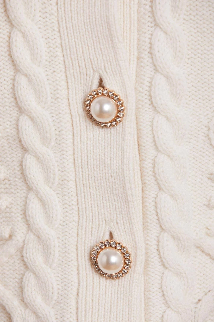 NEEDLE & THREAD EXCLUSIVE. The Flower Applique Short Cardigan in Cream. Made from soft wool, this cardigan is beautifully decorated with faux pearl and crystal-embellished buttons. Designed with pretty crochet flowers, intricate trailing cables and bobbles, creating feminine detail throughout. The knit you will be forever thankful for.