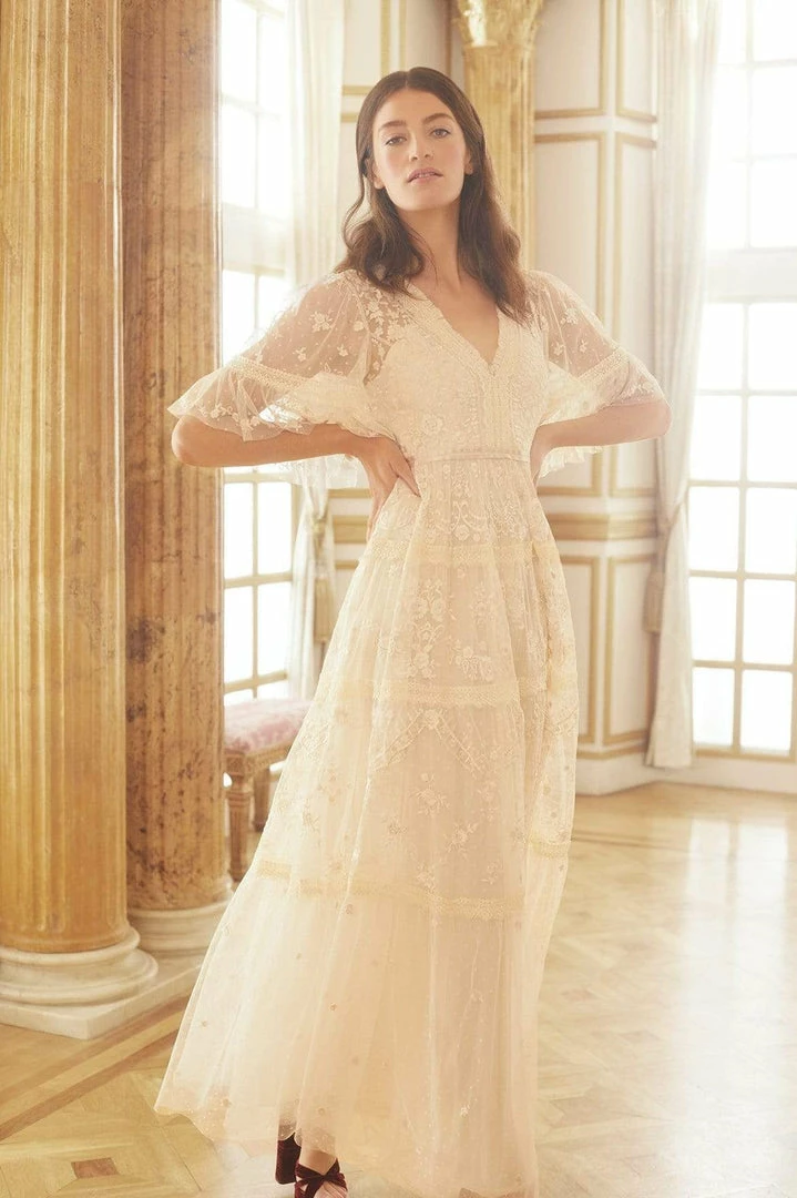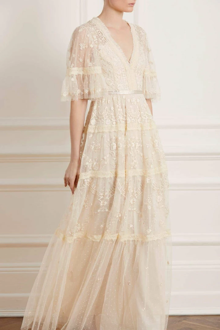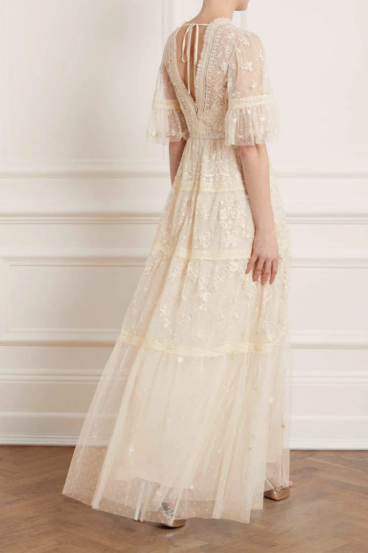 The Lottie Lace Gown in Champagne. A signature Needle & Thread style, updated for the new season ahead. Taking inspiration from Victorian lace, the Lottie features intricately embroidered artwork in a romantic red on delicate tulle. Lace trims border the neckline and frame each tier of the skirt. This embroidered lace gown has sheer, romantic sleeves and our signature grosgrain ribbon at the waist. The perfect gown to take you from day to night.