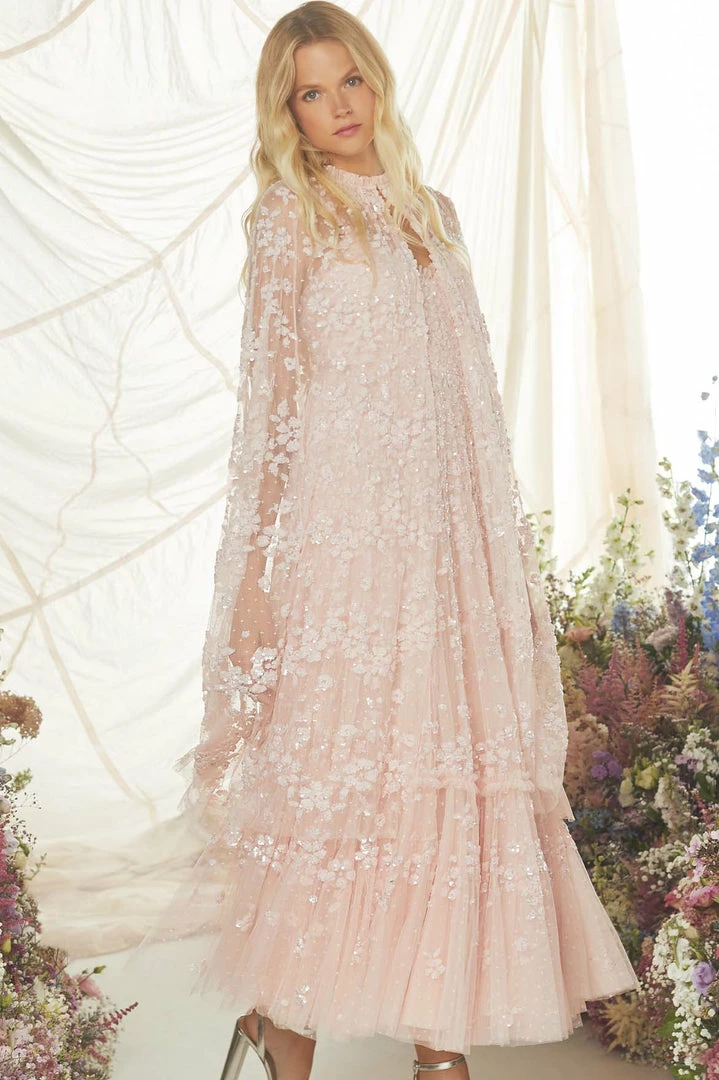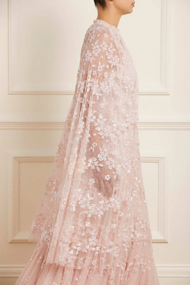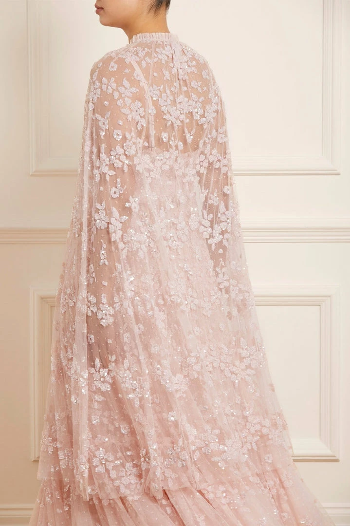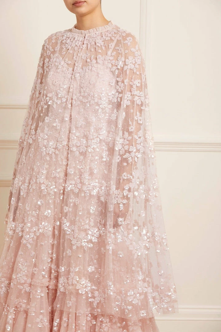 The Margot Midaxi Cape in Petal Pink. This cape is adorned with a floral, sequin artwork creating an all over shimmer effect. Crafted with a hook fastening at the neckline for effortless styling. Designed to layer over the Margot Cami Ankle Gown for a statement look. Make this cape your new go-to piece.