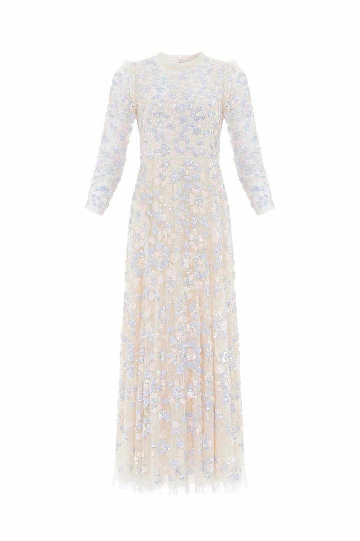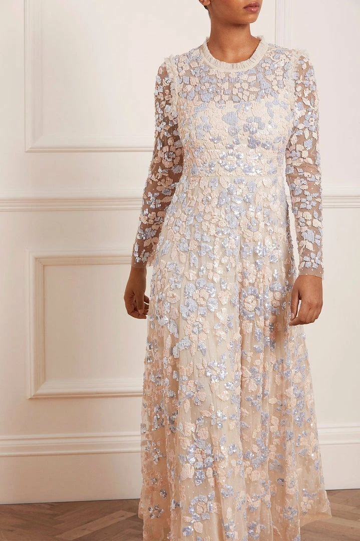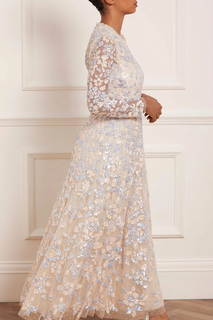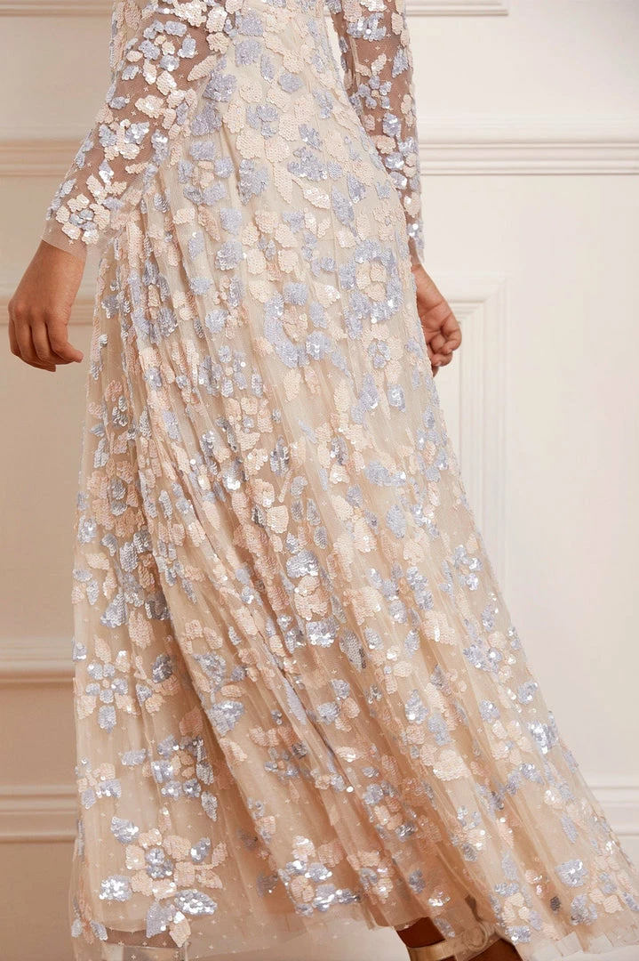 The Mary Rose Ankle Gown in Champagne / Blue Multi. This romantic gown features a two tone floral sequin design creating a statement artwork. Beautifully crafted with a flattering silhouette. A net underlayer helps to shape this elegant piece. A truly show-stopping gown.