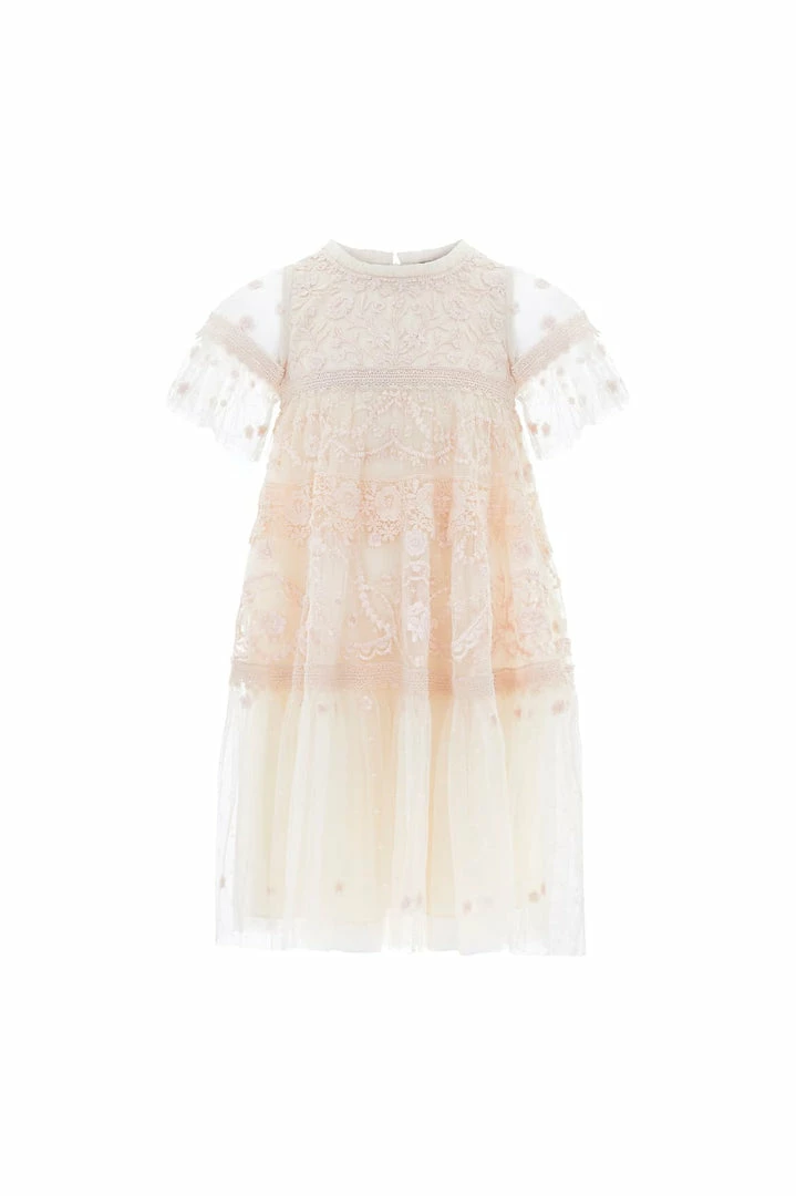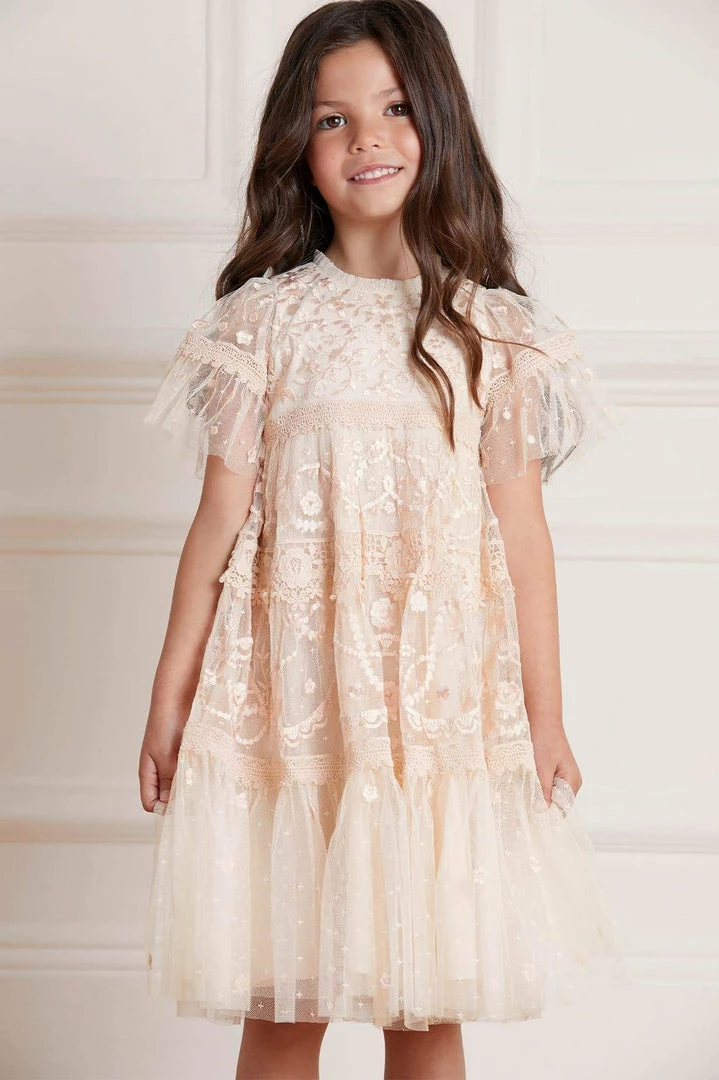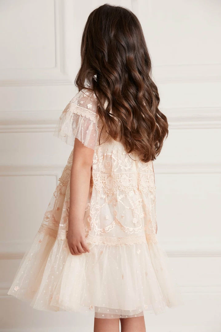 The Midsummer Lace KIDS Dress in Desert Pink / Champagne. This dress is beautifully designed with scattered floral motifs and intricate scallop border designs, depicted in champagne embroidery threads on delicate kisses tulle. This embroidered lace dress has short cap sleeves and a multi-layered tulle skirt with frill detailing throughout. The Midsummer Dress is fit for a princess.