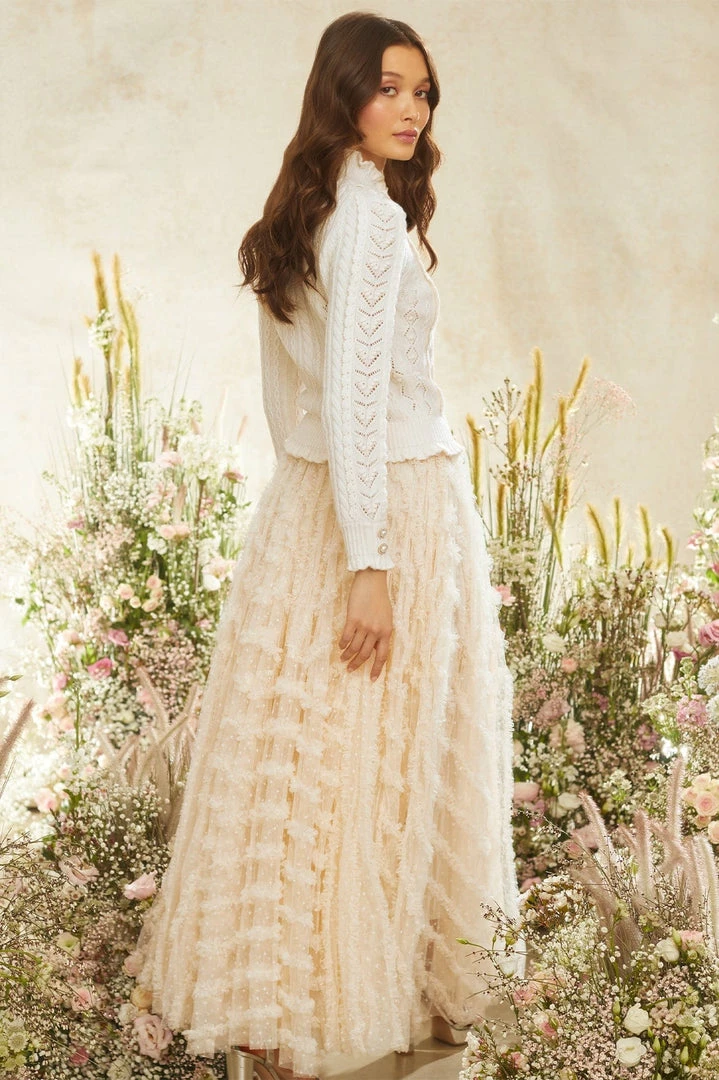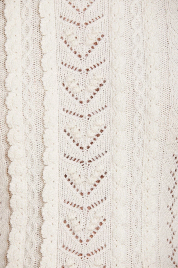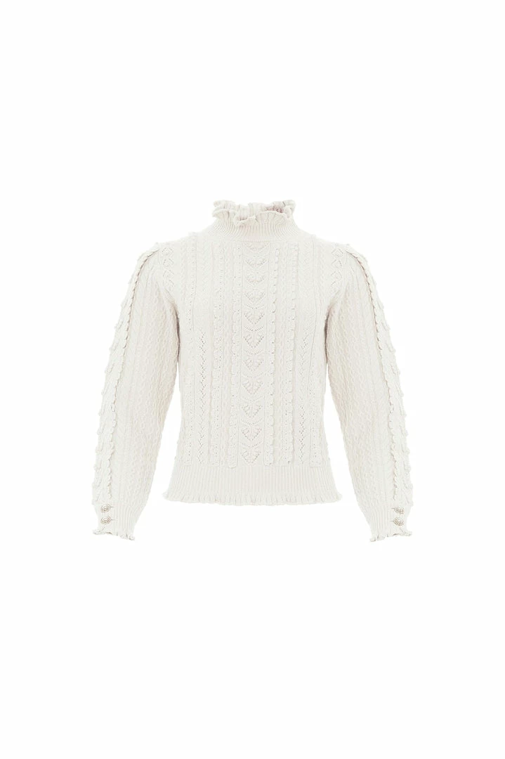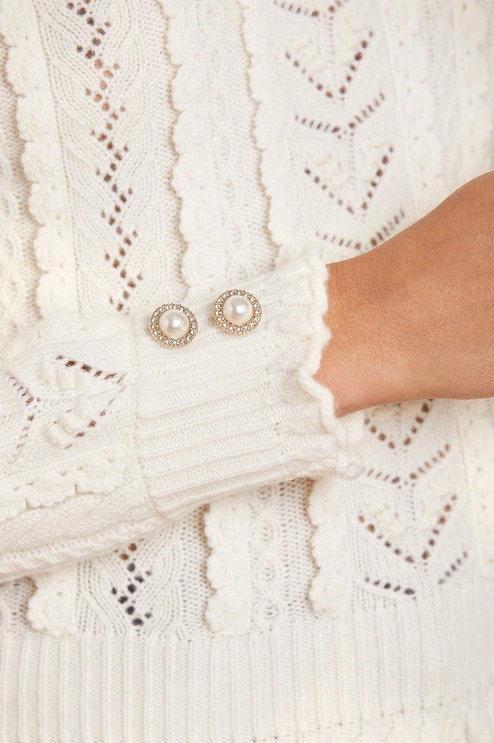 NEEDLE & THREAD EXCLUSIVE. The Mixed Stitch Crochet Trim Short Jumper in Cream. Crafted from soft wool, this jumper features a neckline inspired by vintage Victoriana high neck blouses. Decorated with delicate hand crochet trims, it has a fitted silhouette and mixed cable and bobble details, plus faux pearl and crystal buttons on the cuff for feminine styling. Make this sweater your new season go-to.