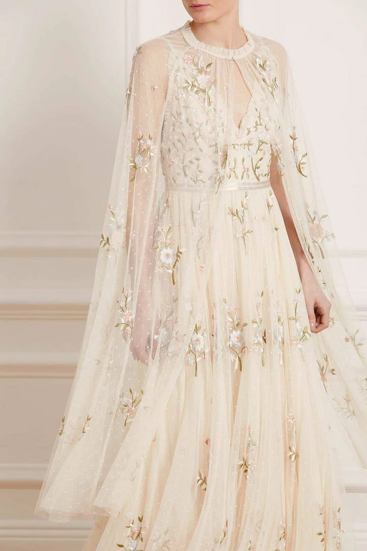 The Petunia Midaxi Cape in Champagne. Inspired by Edwardian vintage artwork, this elegant cape is made up of scattered, richly embroidered bouquets of delicate florals in soft, pastel shades and subtly vibrant green highlights. Shimmering iridescent sequins scattered throughout add a glistening effect to the piece. Intricately cut with fine, delicate tulle ruffle trimming and a relaxed shape, creating a truly romantic silhouette.
