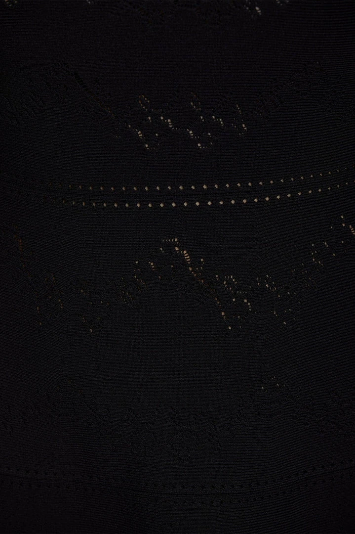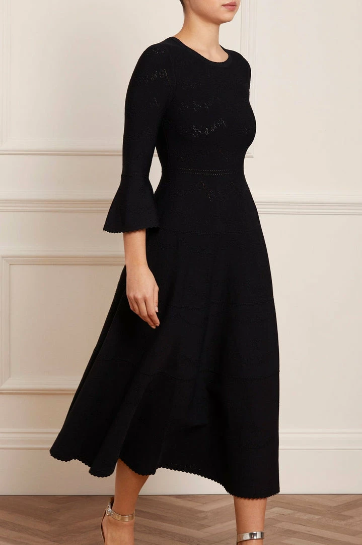 NEW SEASON. The Pretty Pointelle Knit Ankle Gown in Black. A brand new style for Needle & Thread. This knitted gown is inspired by vintage ditsy florals and lace. Beautifully designed with all-over pretty pointelle stitch, delicate florals and scallop details. This gown has a fitted stretch bodice with a soft, round neckline, fluted cuffs and signature Needle & Thread detailing. A truly flattering piece.