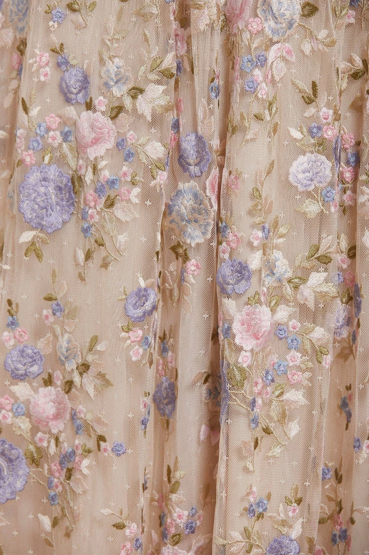 NEW SEASON. The Rose Dream Strapless Corset Ankle Gown in Champagne/Blue Multi. This ankle gown is intricately embroidered with soft clusters of floral motifs in fresh, romantic pastel tones. Beautifully crafted with a flattering skirt shape, inspired by vintage couture styling. The bodice is integrated with a corset made with ribbon stitching, soft boning and panels of stretch mesh fabric for comfort and security in the fit. A true fairytale piece.