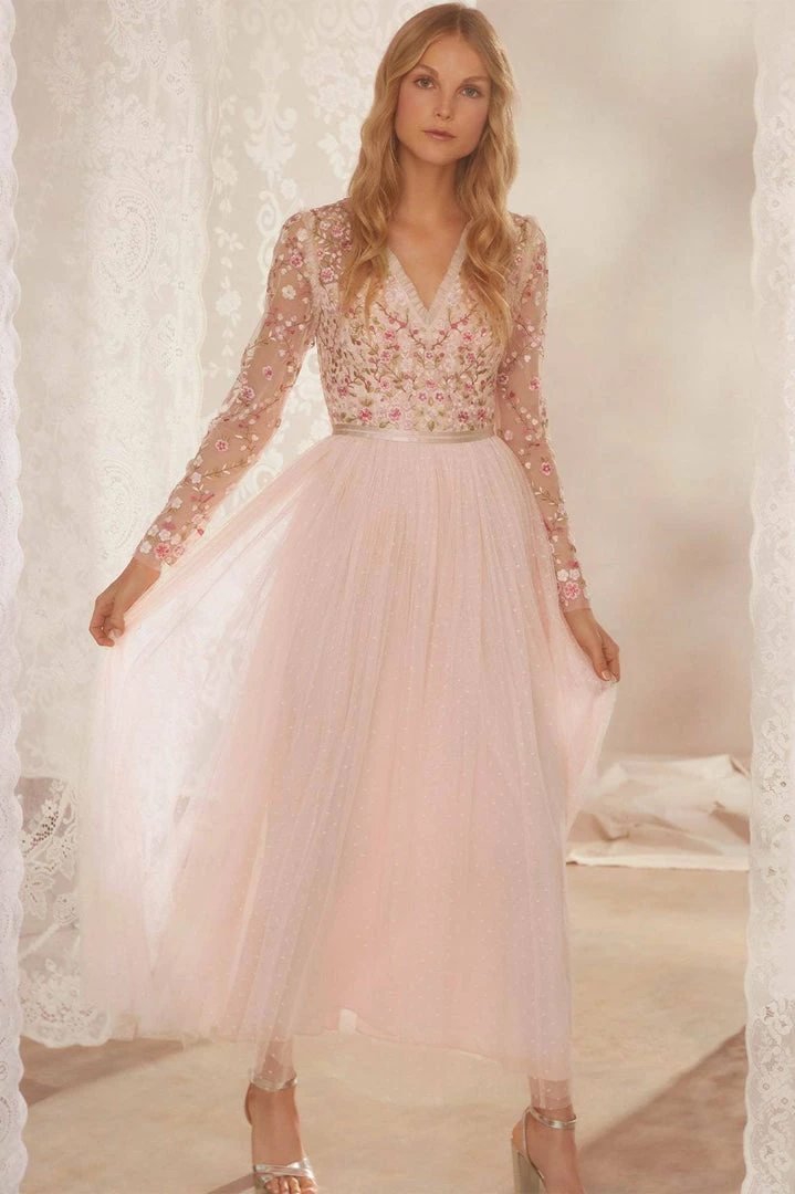 NEEDLE & THREAD EXCLUSIVE. The Rosie Lace Bodice Long Sleeve V-Neck Ankle Gown in Petal Pink. Beautifully decorated with embroidery throughout, this gown features rose floral motifs, lace borders and a satin waistband. Its skirt is crafted from soft tulle with an ‘x’ motif design. The perfect gown for every special occasion.