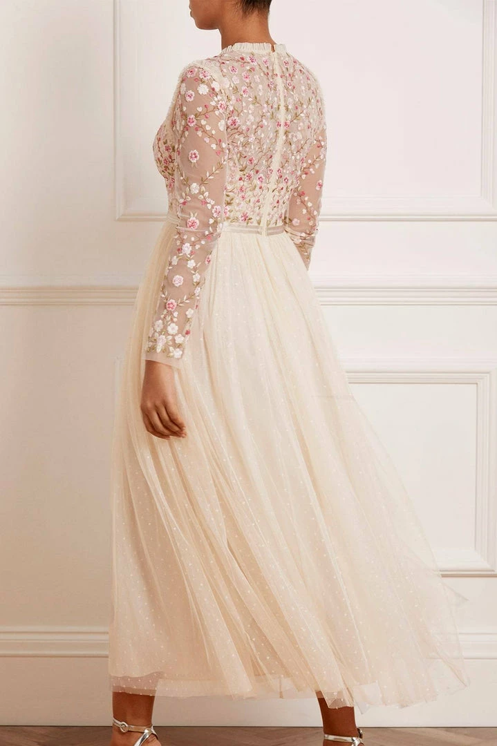 The Rosie Lace Bodice Long Sleeve V-Neck Ankle Gown in Champagne. Beautifully decorated with embroidery throughout, this gown features rose floral motifs, lace borders and a satin waistband. Its skirt is crafted from soft tulle with an ‘x’ motif design. The perfect gown for every special occasion.