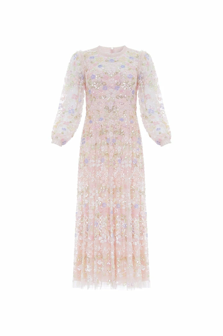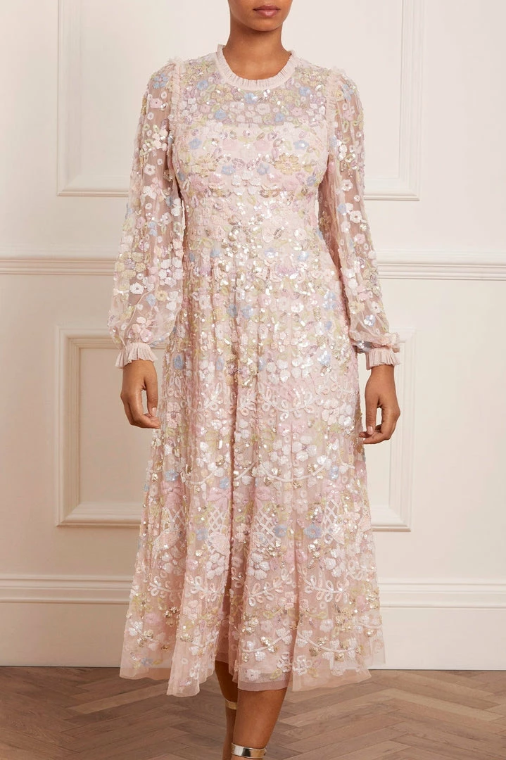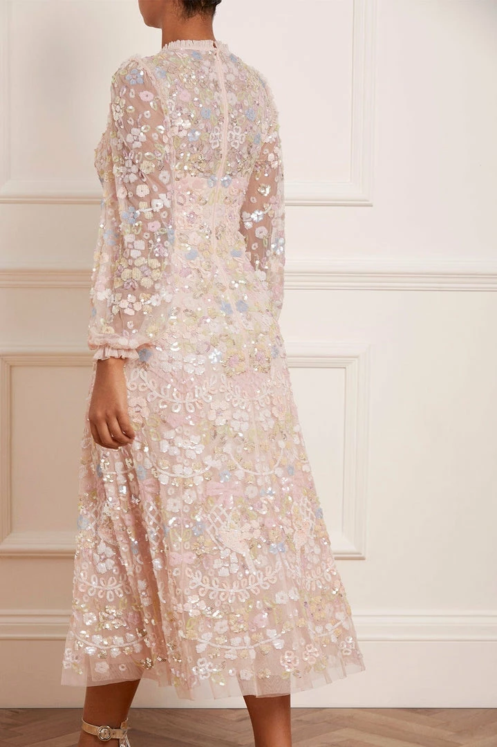 The Shimmer Fairytale Ballerina Dress in Petal Pink / Sundaze. Intricately adorned with a multi-coloured floral and bird artwork with shimmering sequins to create a romantic look. Beautifully designed with long sleeves, a round neckline and Needle & Thread signature detailing. This dress is developed with a tulle net skirt to create a flattering silhouette. The ultimate fairytale piece.