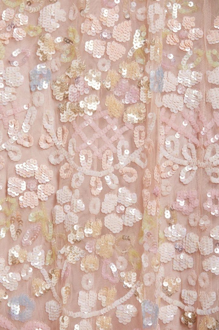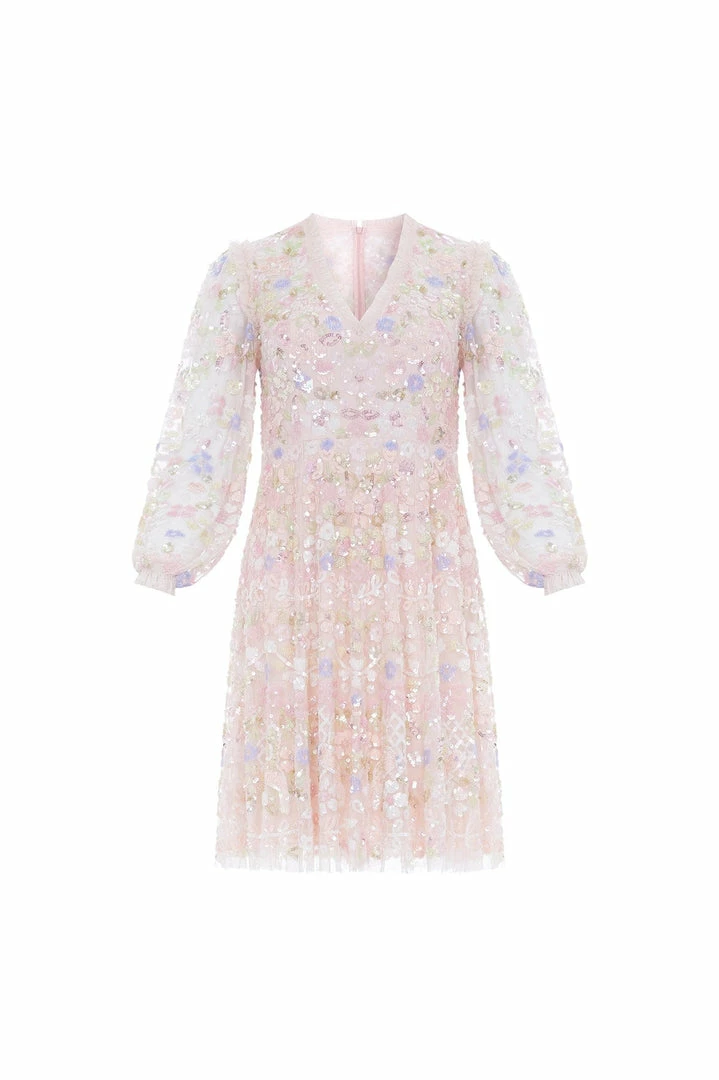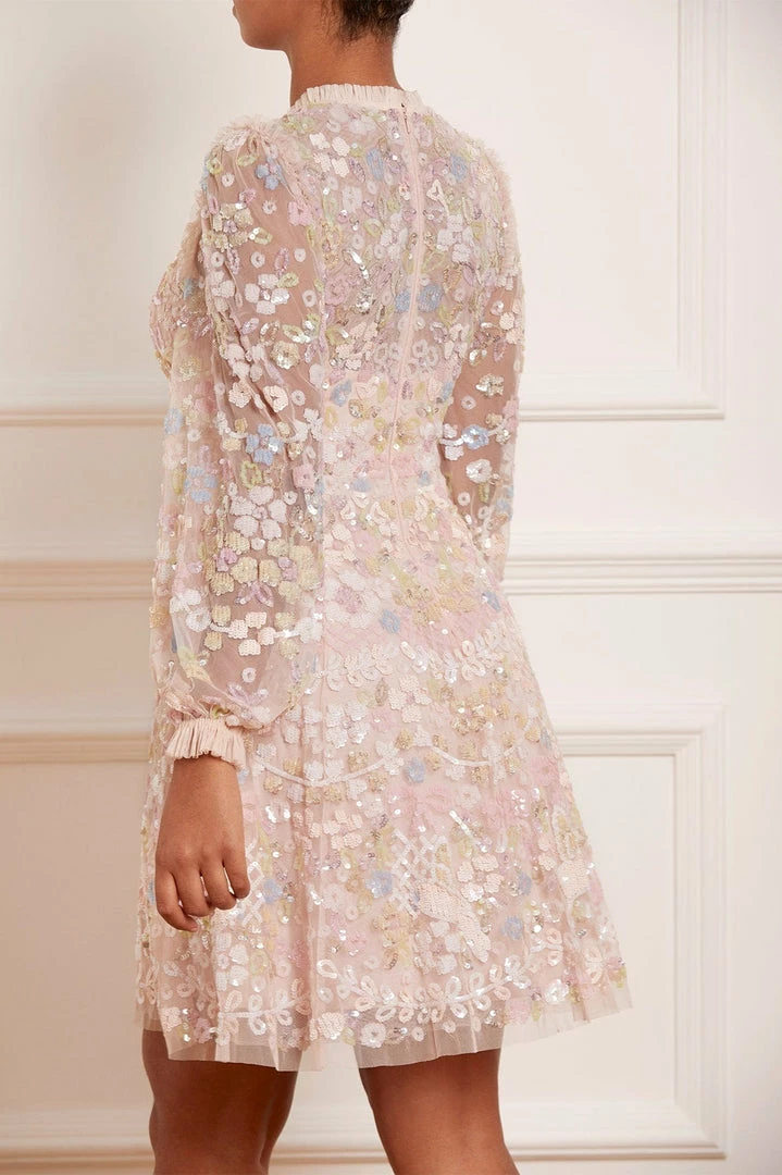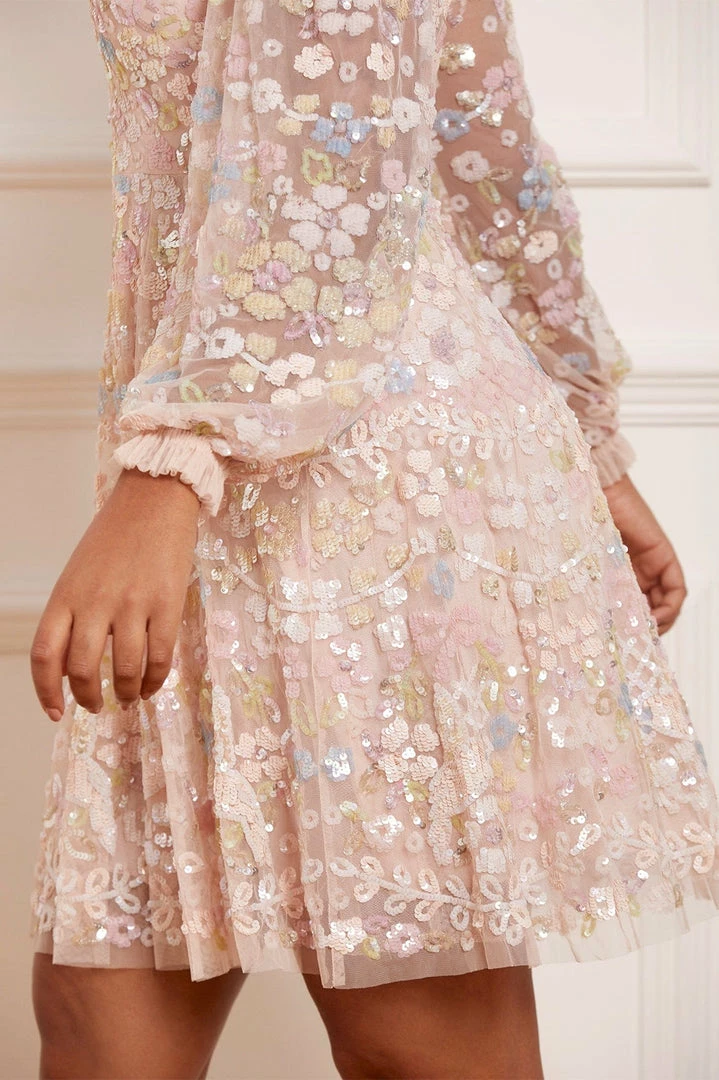 The Shimmer Fairytale V-Neck Mini Dress in Petal Pink / Sundaze. Intricately adorned with a multi-coloured floral and bird artwork with shimmering sequins to create a romantic look. Beautifully designed with long sleeves, a V-neckline and Needle & Thread signature detailing. This mini dress is developed with a tulle net skirt to create a flattering silhouette. The ultimate fairytale piece.