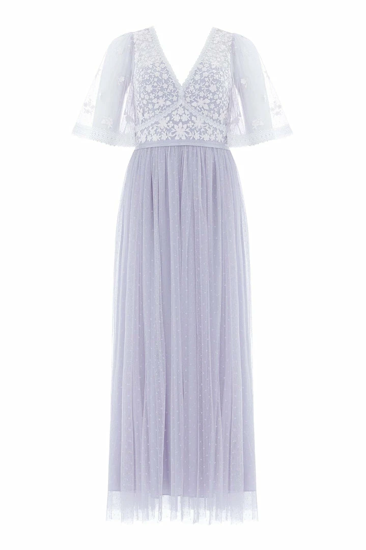 NEW SEASON. The Sweetheart Lace Bodice Ankle Gown in Porcelain Blue/White. A signature Needle & Thread style. The bodice of this gown is embroidered delicately with a floral lace artwork. Beautifully trimmed with a satin waistband and a textured kisses tulle skirt for romantic movement. The perfect gown to take you from day to night.