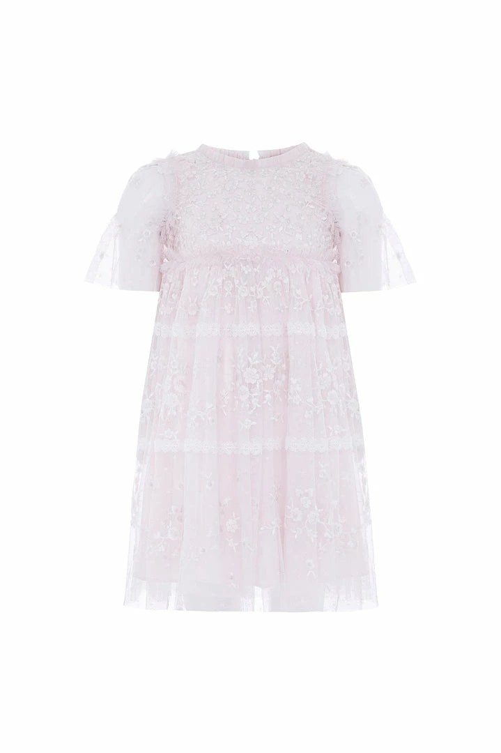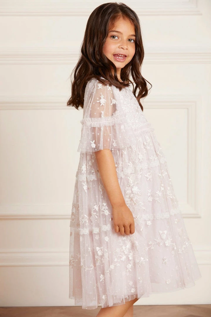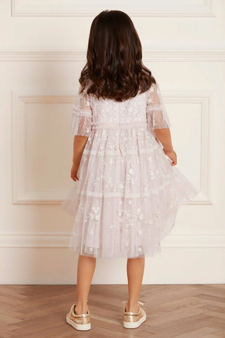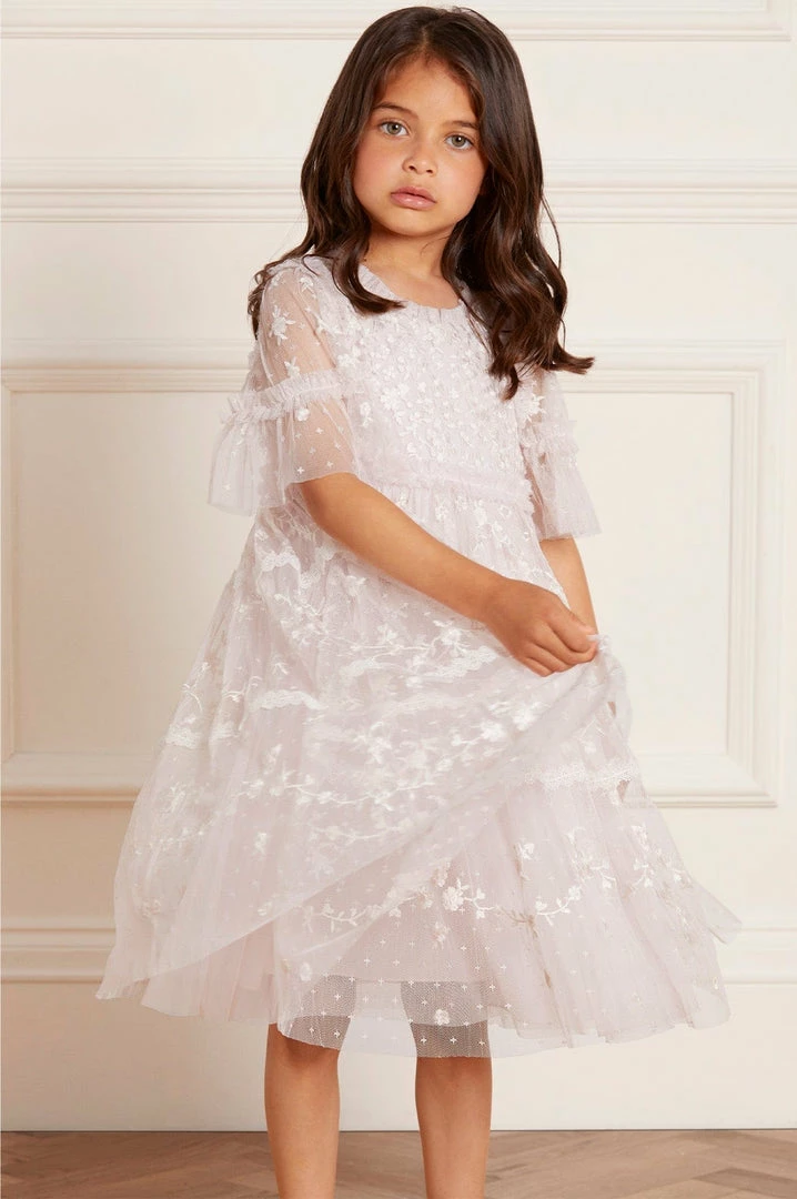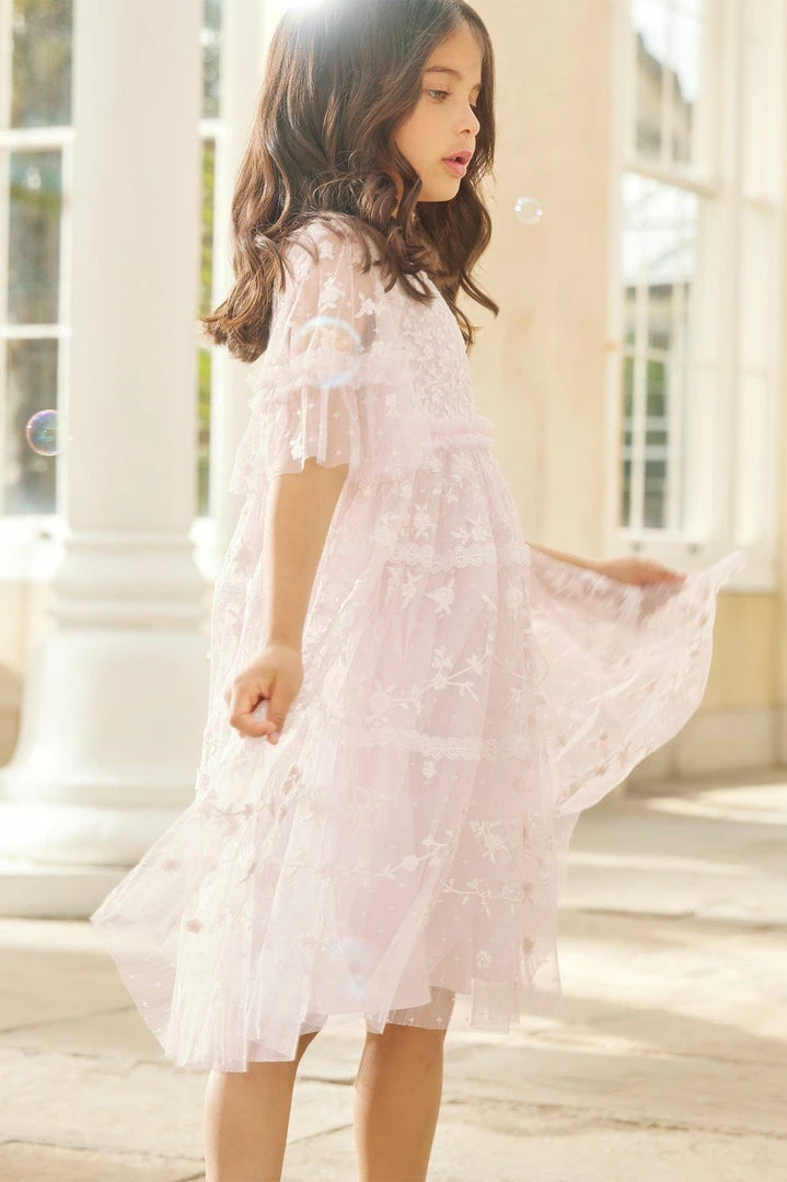 NEW SEASON. The Sweetheart Lace KIDS Dress in Powder Pink/White. A signature Needle & Thread style, this dress is delicately embroidered with la floral lace artwork. Designed with trimmed lace and tiers for signature detailing. Developed from our textured ‘x’ kisses tulle for playful movement. Make the Sweetheart her new wardrobe favourite.