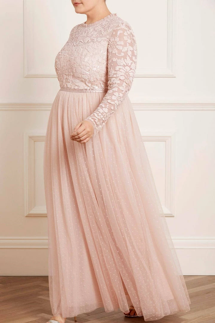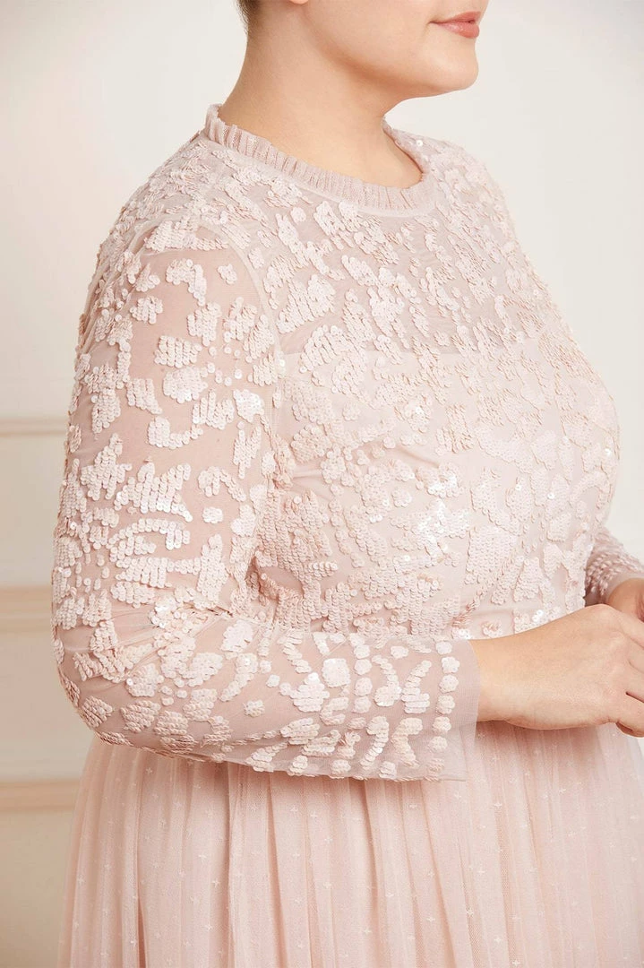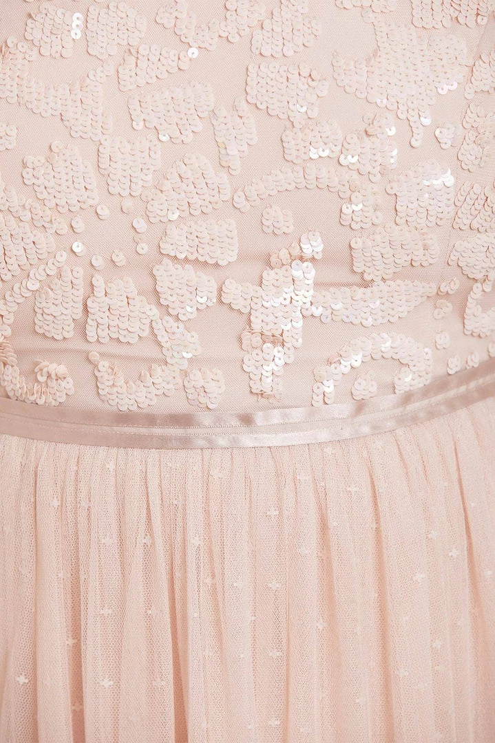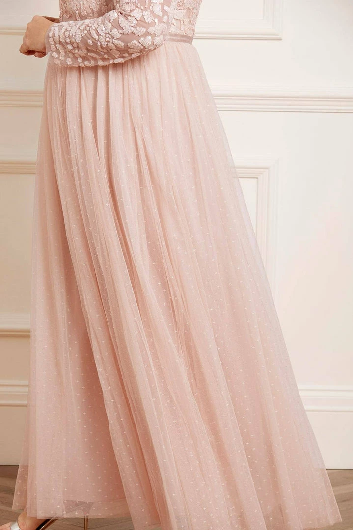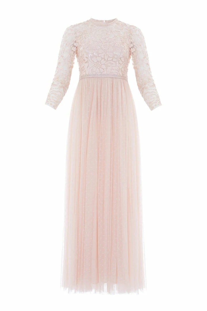 NEEDLE & THREAD EXCLUSIVE. The Tempest Bodice Gown in Strawberry Icing / Pink. Inspired by a vintage lace tablecloth design, this beautiful gown is embellished with shimmering sequins all over the bodice. Designed with long sleeves, a tulle multi-layered skirt and frill trim detailing around the neck. Make an entrance in the Tempest.