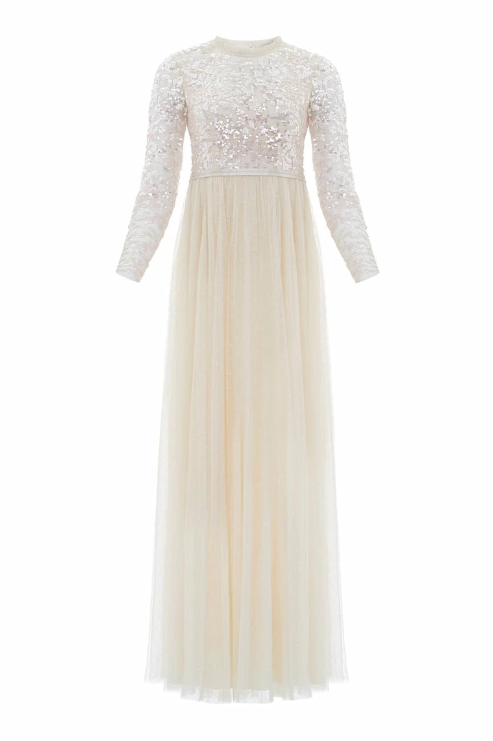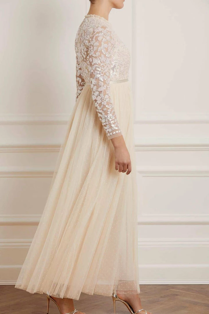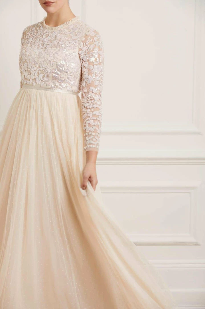The Tempest Bodice Maxi Dress in Champagne / Pink. This beautiful maxi dress has been inspired by a vintage lace tablecloth, embellished with shimmering sequins all over the bodice. Designed with long sleeves, a kisses tulle multi-layered skirt and frill trim detailing around the neck. Make an entrance in the Tempest.