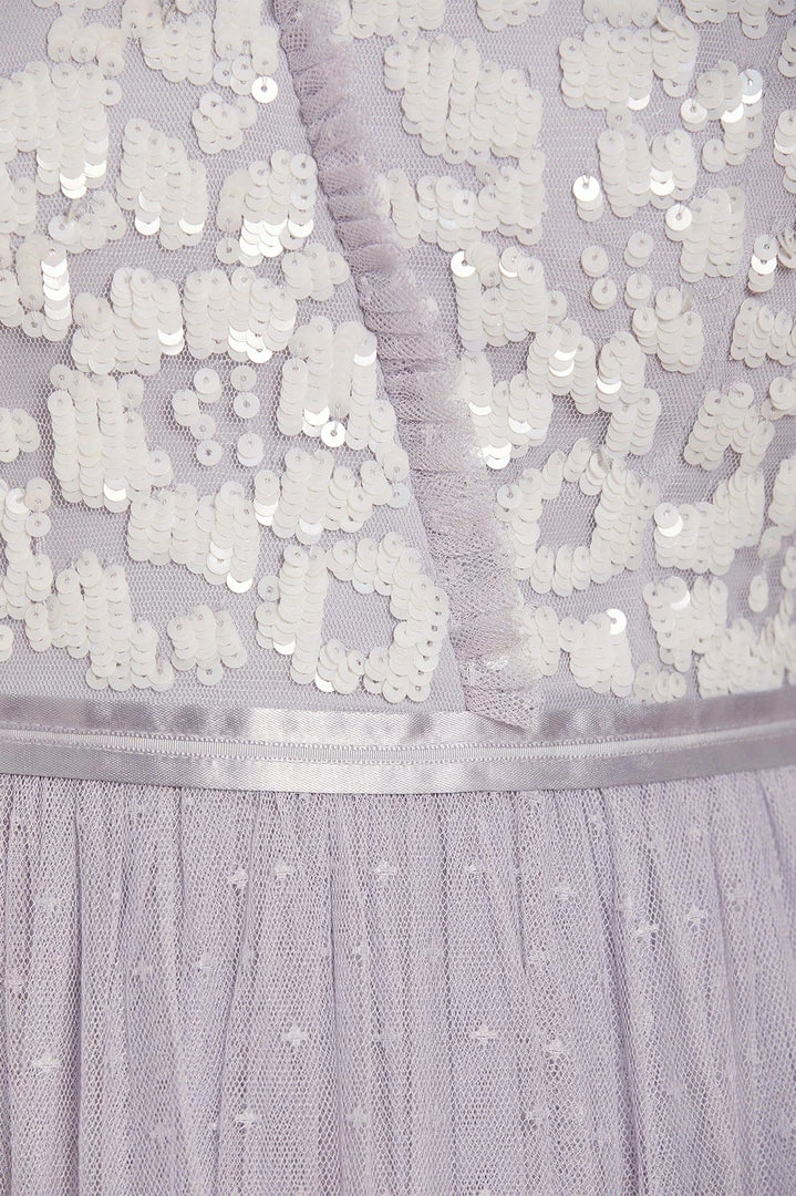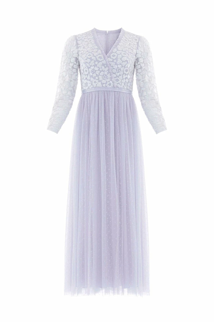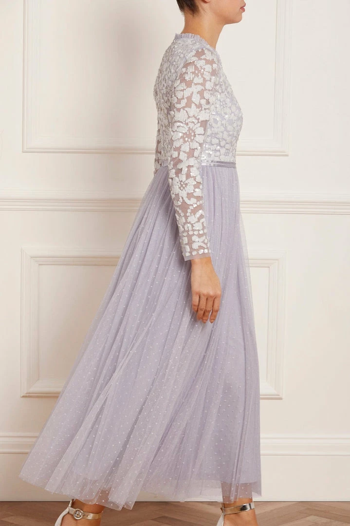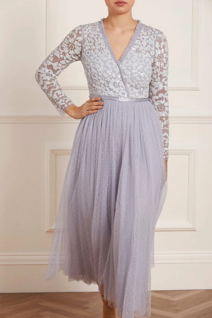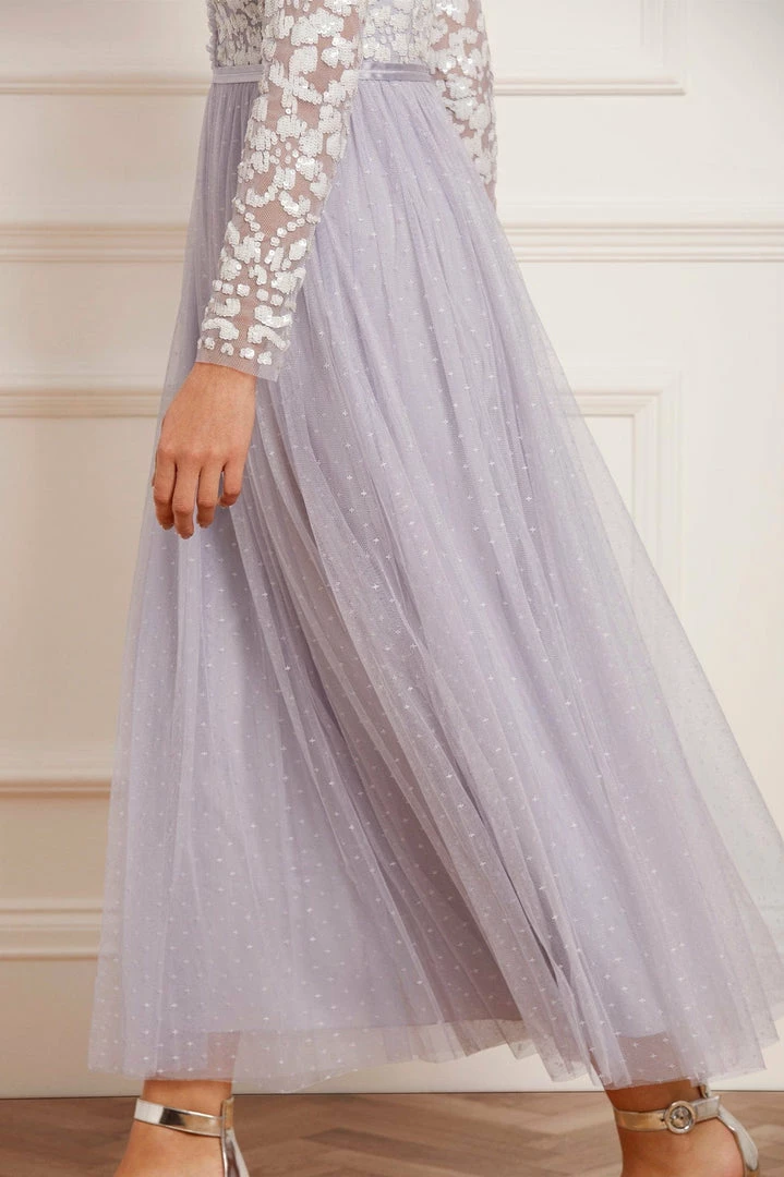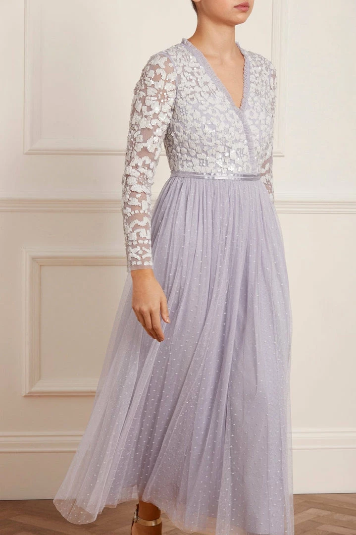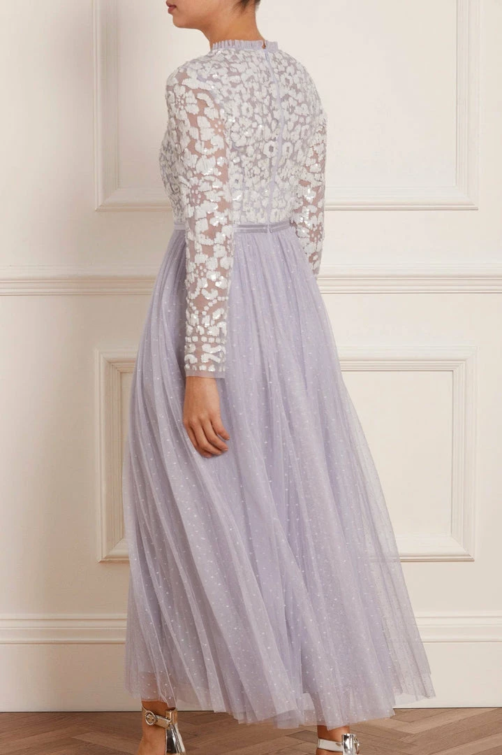 NEW SEASON. The Tempest V-Neck Bodice Ankle Gown in Porcelain Blue/White. This beautiful gown is inspired by a pretty vintage lace tablecloth design. The bodice is adorned with sequins, creating an all-over shimmer effect. Crafted with long sleeves, a v-neckline and a tulle multi-layered skirt. Make an entrance in the Tempest at your next event.