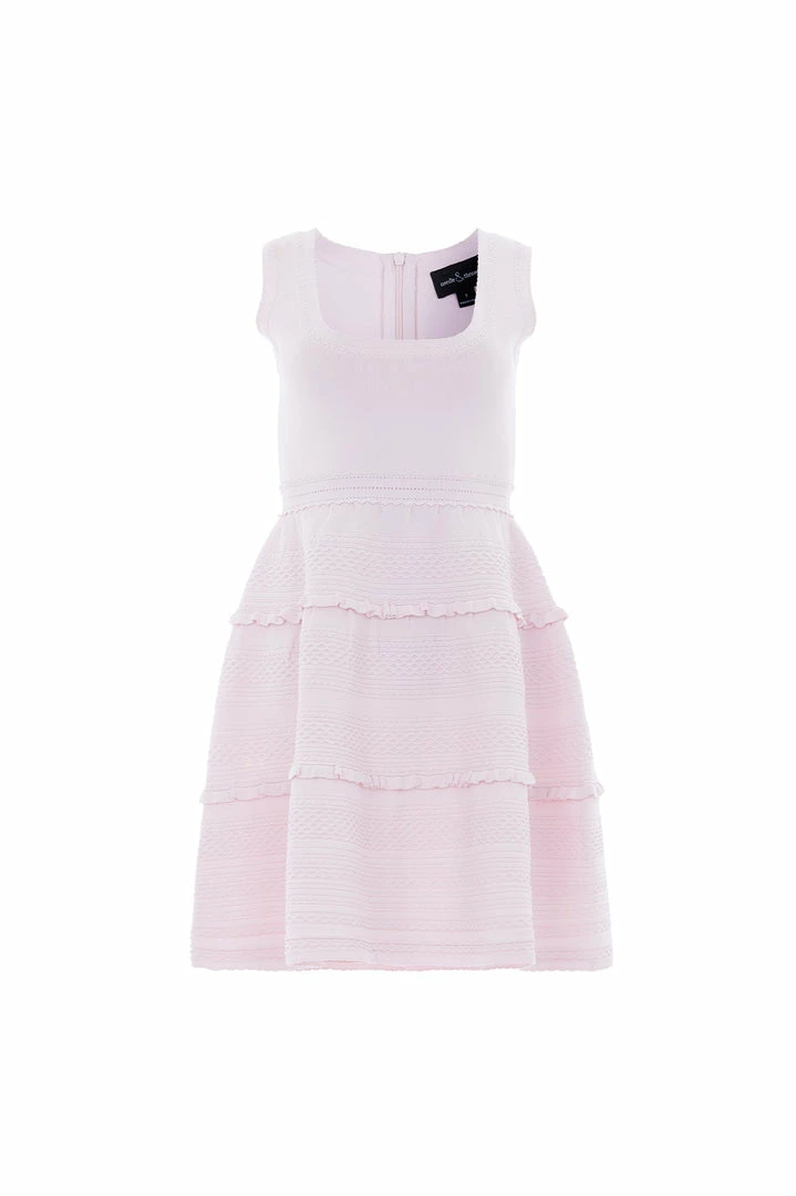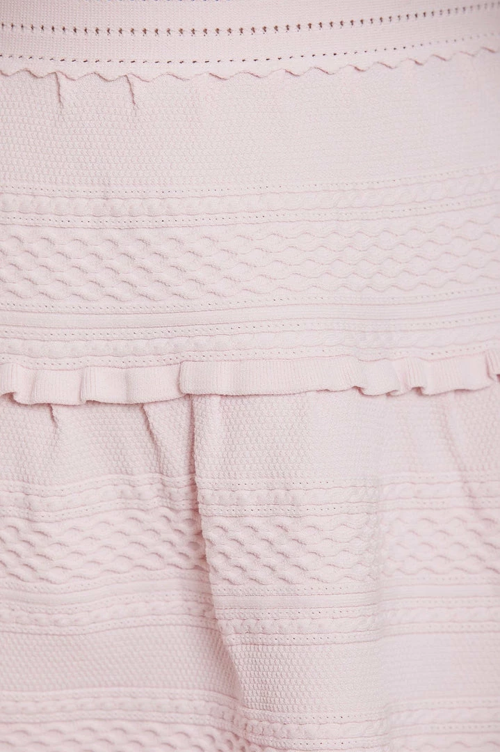 NEW SEASON. The Textured Knit Sleeveless Mini Dress in Pink. This knitted dress is intricately designed with scallop and pointelle trims for signature Needle & Thread detailing. Beautifully developed from a stretch, yarn fabric that makes the dress easy to wear and comfortable. This sleeveless dress is adorned with perfectly placed knitted ruffles, lace cable details and a voluminous skirt. Make this dress your new wardrobe staple.