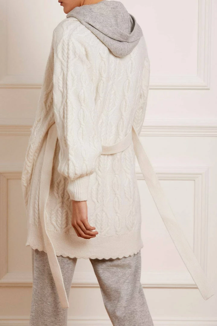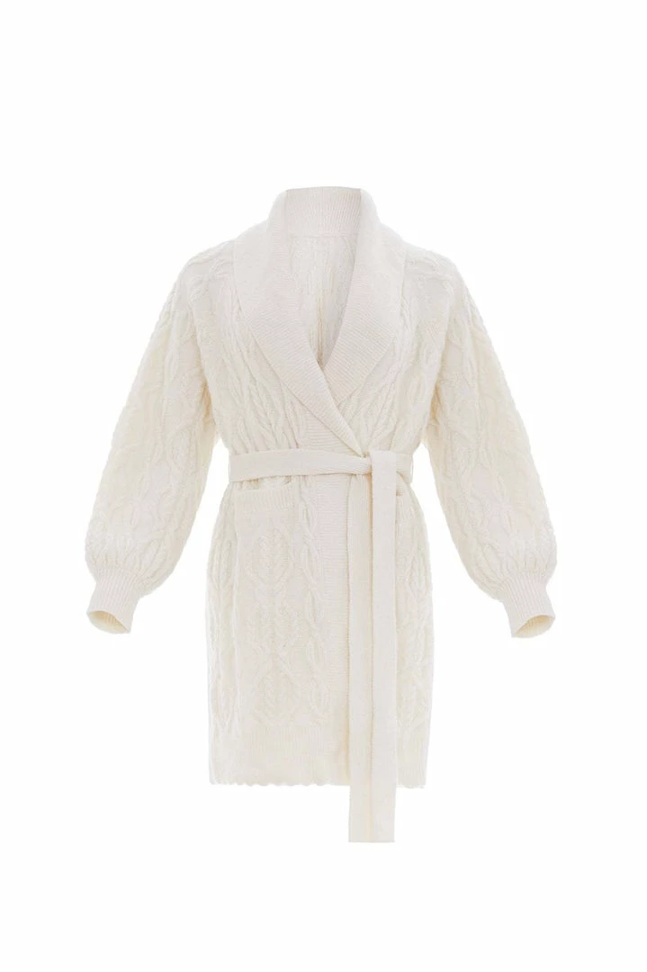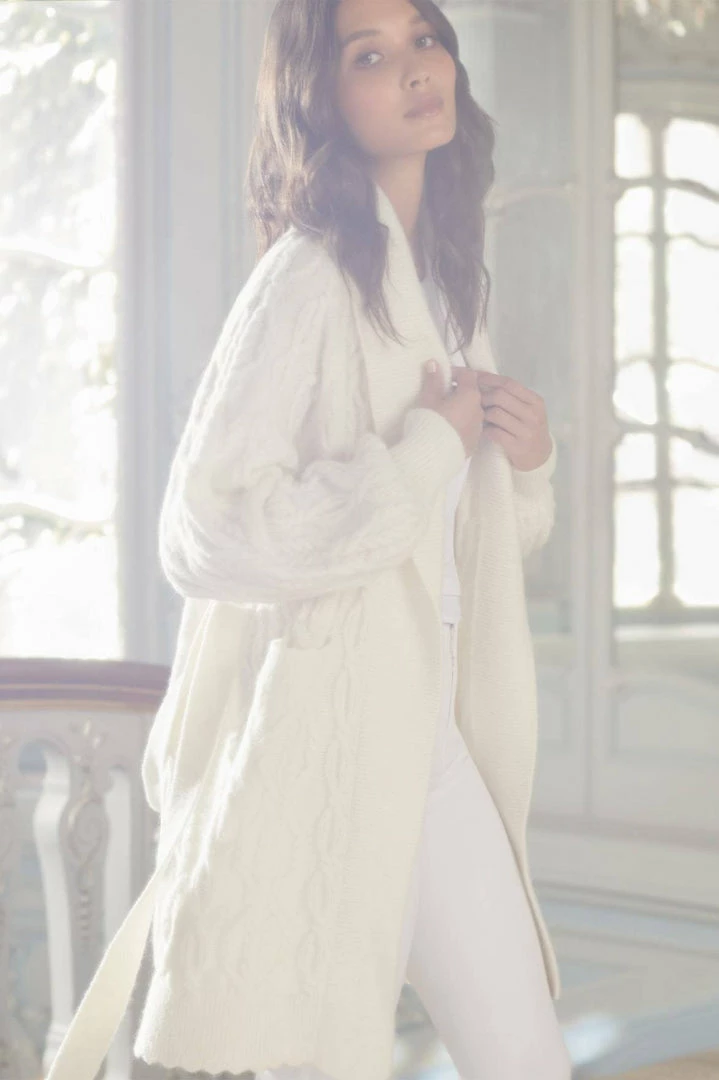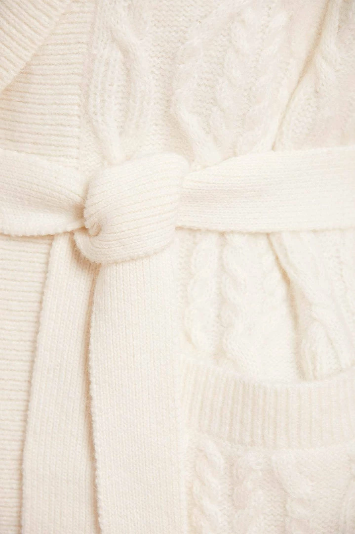 The Twisted Cable Knee-Length Cardigan in Champagne. This soft cardigan is developed from alpaca yarn, creating a luxe, cosy feel and fluffy texture. Crafted with mixed cables in bold, oval shapes intricately intertwined throughout. Designed with voluminous sleeves, a belt for easy styling and pockets for the perfect finish. Beautifully adorned with a scallop edge on the hemline for signature Needle & Thread detailing. The perfect everyday piece.