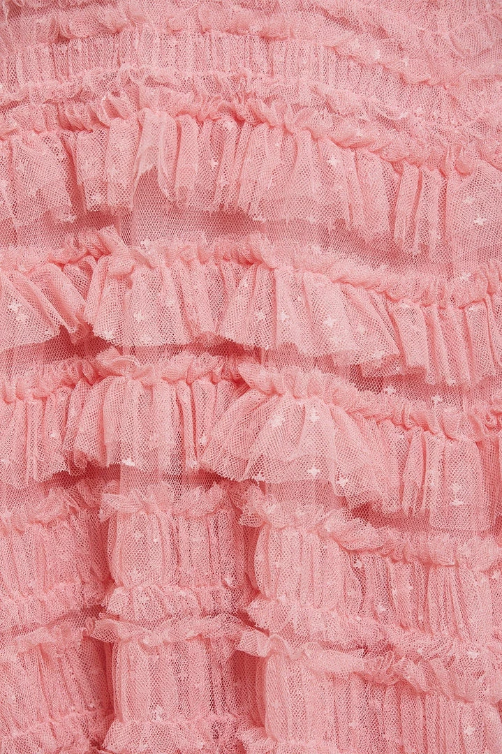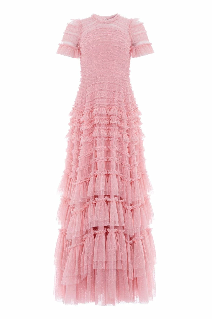 NEW SEASON. The Valentine Ruffle Gown in Rose Pink. A signature Needle & Thread style developed with textile ruffles and flattering tulle, creating a romantic look. The ruffles cascade down the dress, starting smaller and gradually getting bigger towards the hem to create soft, fluid movement. Crafted from our signature Needle & Thread kisses tulle. Make a statement in the Valentine.