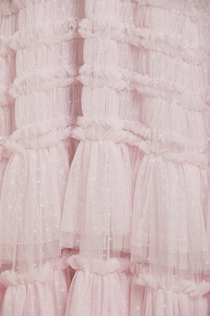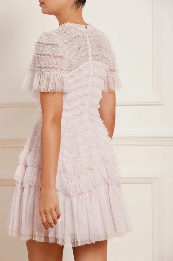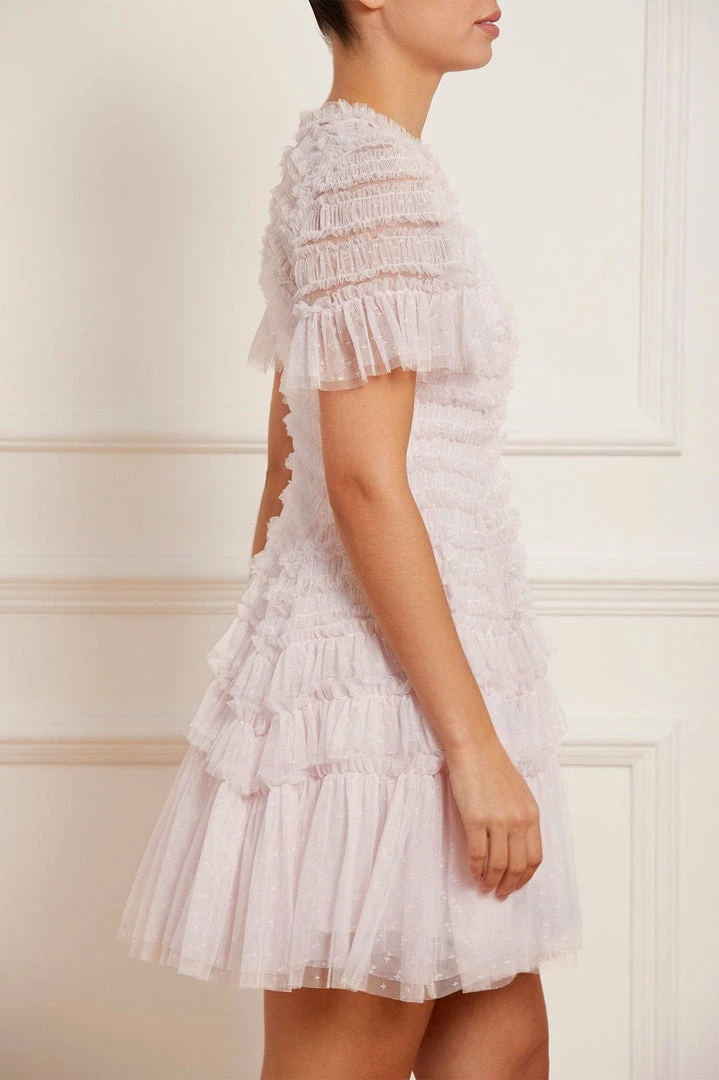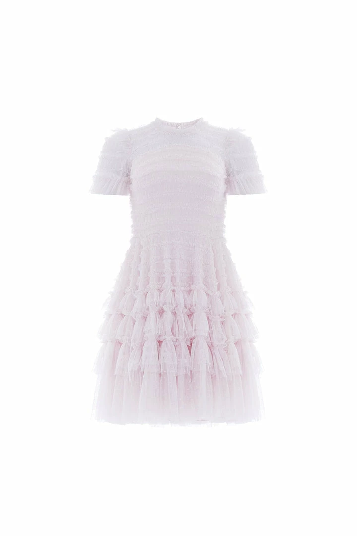 NEW SEASON. The Valentine Ruffle Micro Mini Dress in Powder Pink. A signature Needle & Thread style developed with textile ruffles and flattering tulle, creating a romantic look. The ruffles cascade down the dress, starting smaller and gradually getting bigger towards the hem to create soft, playful movement. Crafted from our signature Needle & Thread kisses tulle. Make a statement in the Valentine.