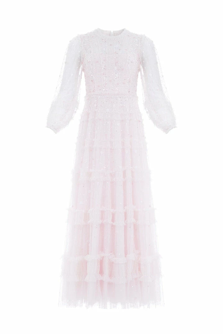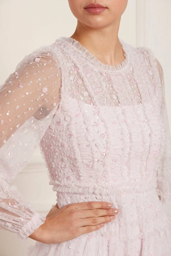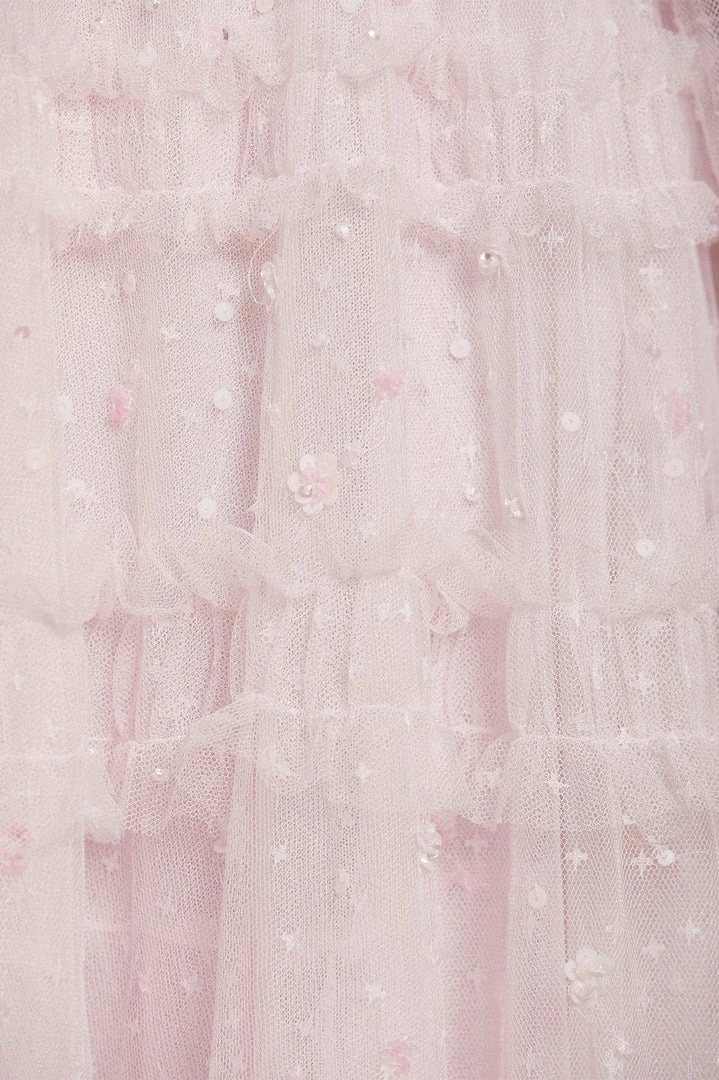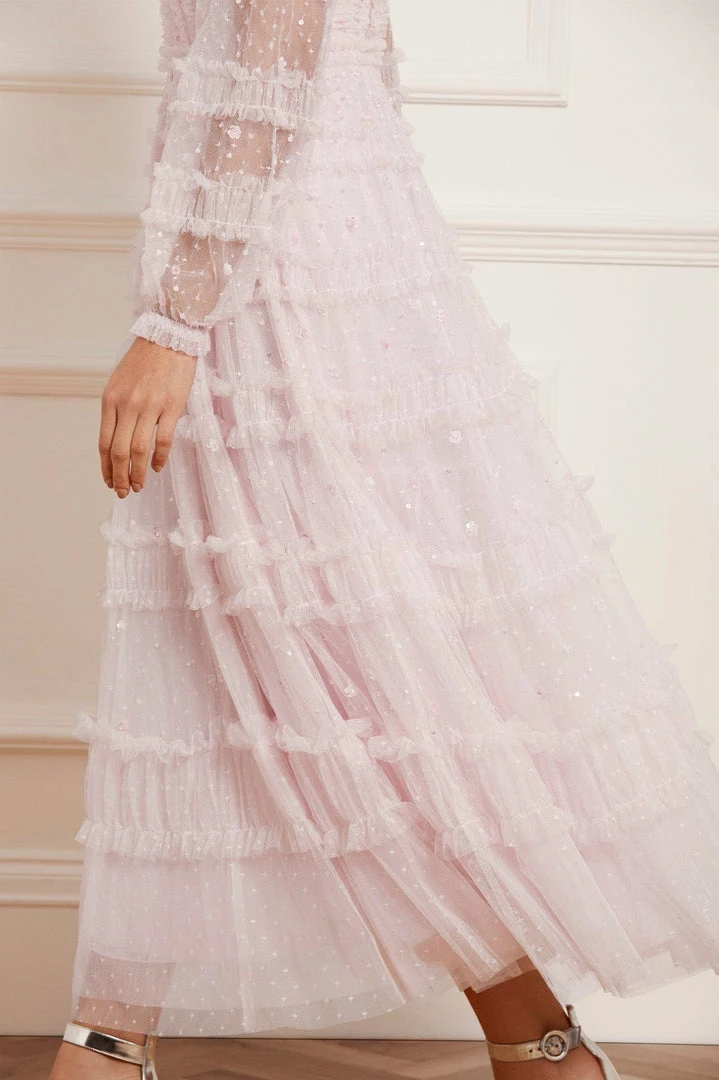 NEW SEASON. The Violet Shimmer Ankle Gown in Powder Pink. This romantic style is delicately scattered with a shimmering sequin artwork. The silhouette is beautifully adorned with double stitch ruffles for added texture. Developed from pretty, kisses tulle for signature Needle & Thread detailing. Shine under the spotlight in the Violet Shimmer.