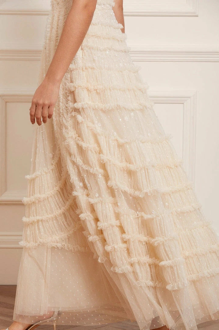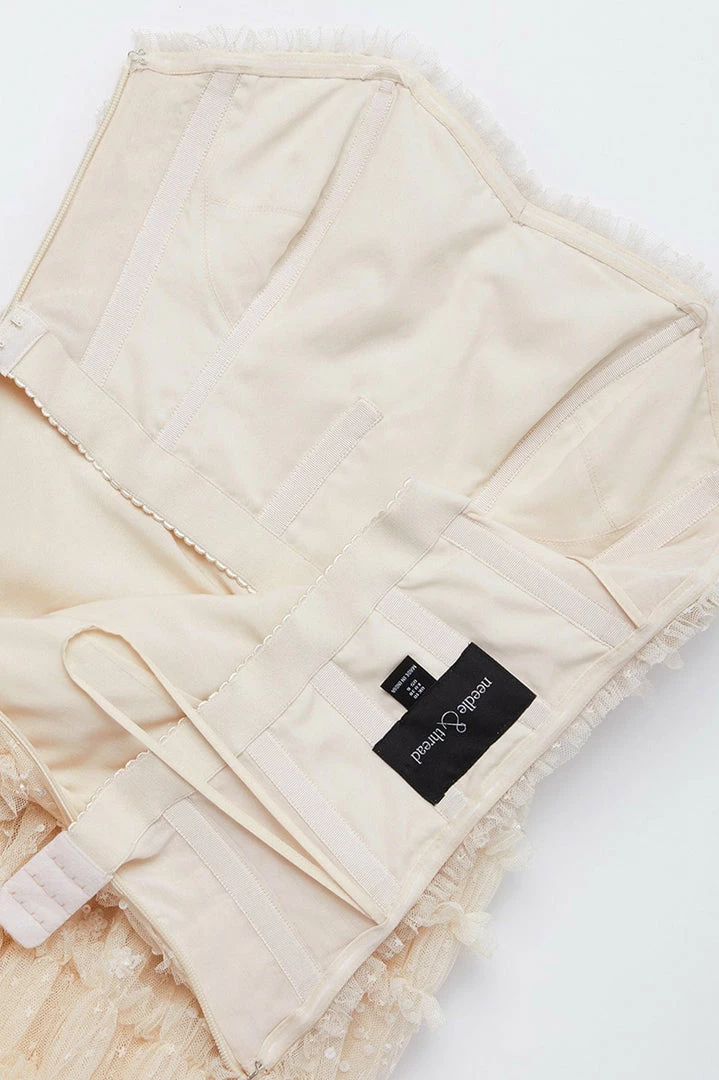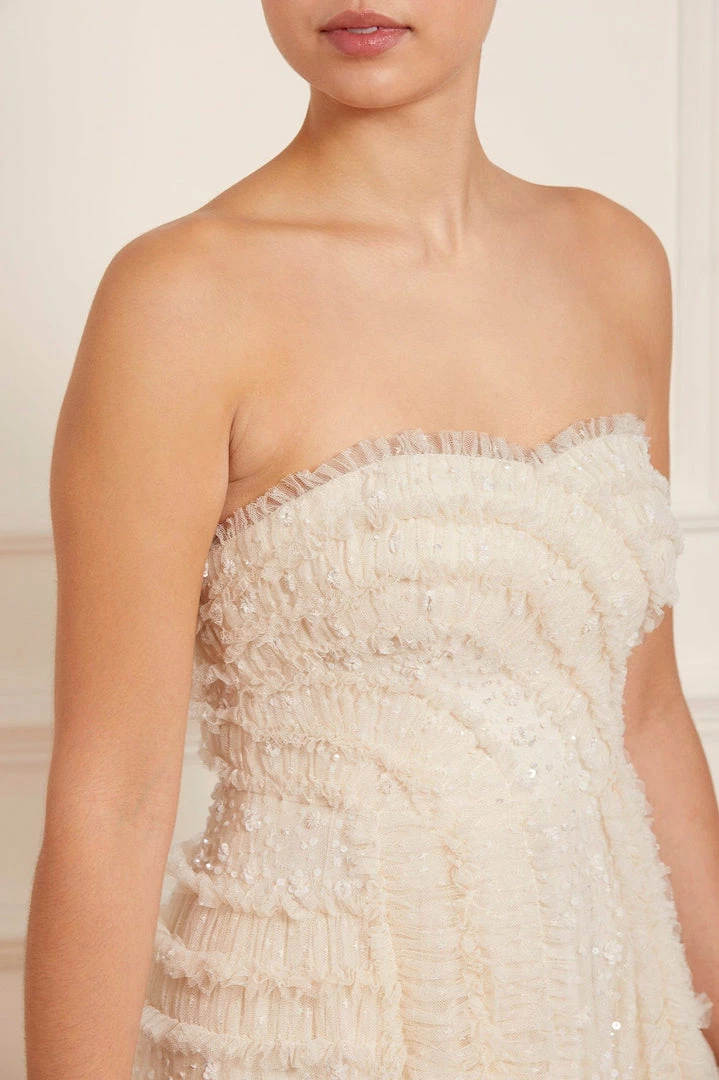 NEW SEASON | NEEDLE & THREAD EXCLUSIVE. The Violet Shimmer Strapless Corset Ballerina Dress in Champagne. This romantic dress is delicately scattered with a shimmering sequin artwork. The silhouette is beautifully adorned with double stitch ruffles creating a dramatic, sweeping statement. Designed with an integrated corset made with ribbon stitching, soft boning and panels of stretch mesh fabric for comfort and security in the fit. Developed from pretty, kisses tulle for signature Needle & Thread detailing. Shine under the spotlight in the Violet Shimmer.