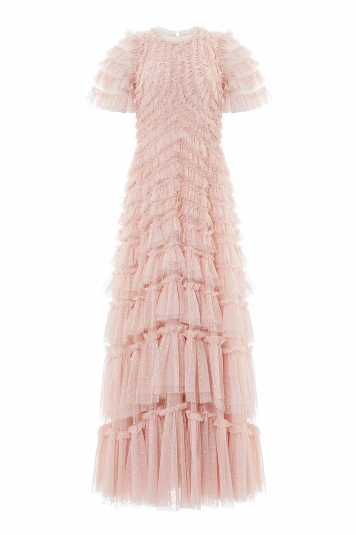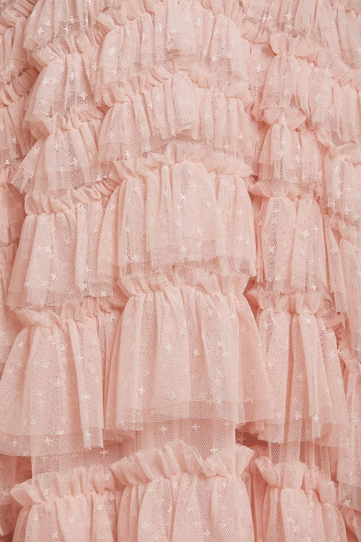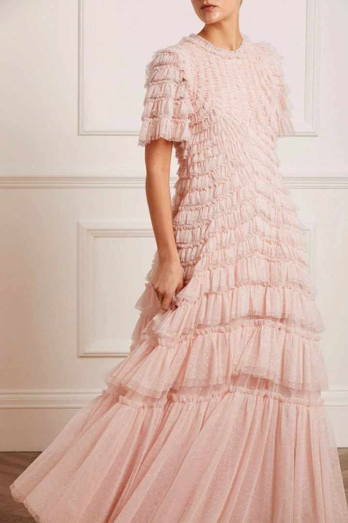 The Willow Ruffle Gown in Petal Pink. A Needle & Thread signature shape. This show-stopping gown is adorned with layers of tulle frills engineered to create a flattering texture. Developed from our kisses tulle, featuring an ‘x’ motif throughout. Make a statement in the Willow.