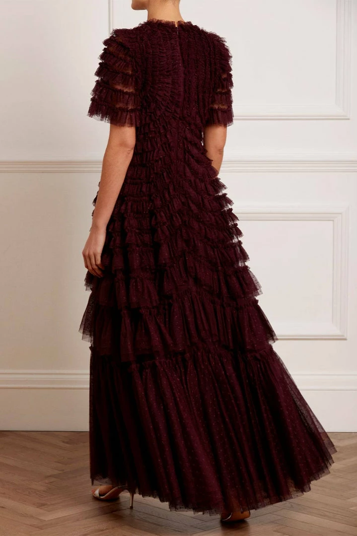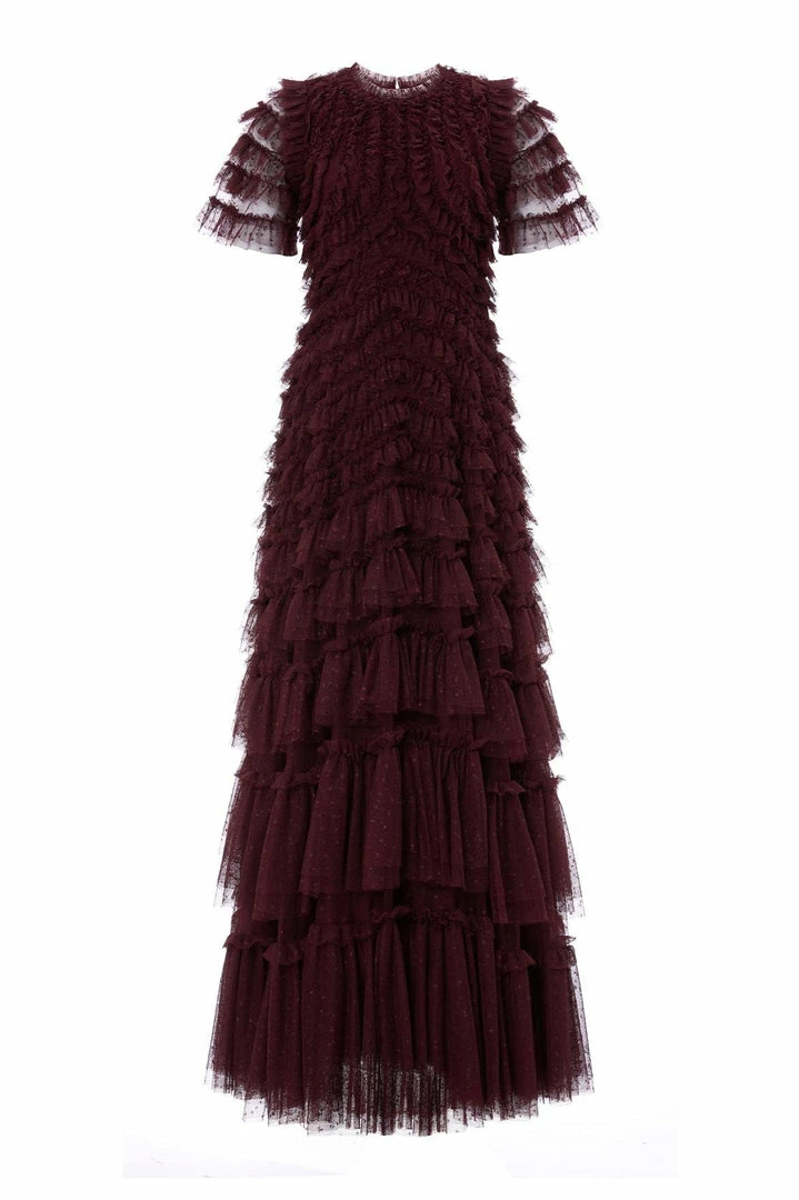 The Willow Ruffle Gown in Burgundy. A Needle & Thread signature shape. This show-stopping gown is adorned with layers of tulle frills engineered to create a flattering texture. Developed from our kisses tulle, featuring an ‘x’ motif throughout. Make a statement in the Willow.