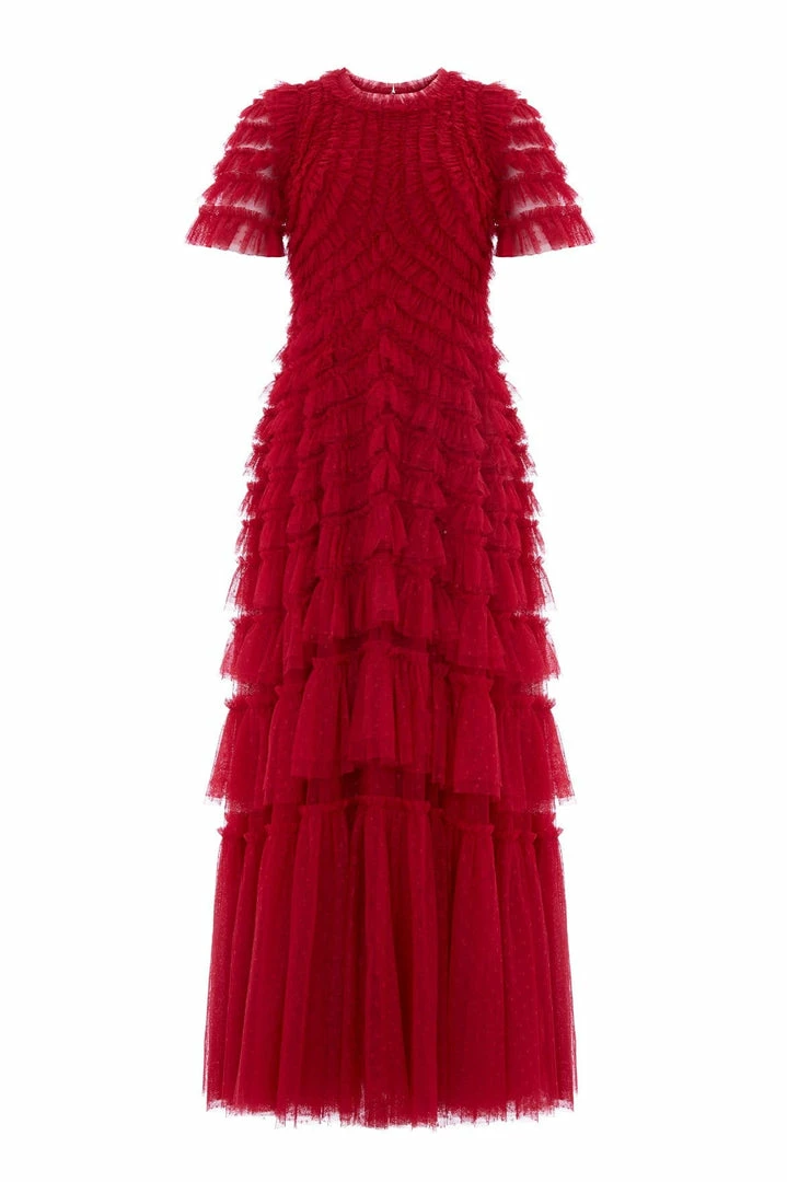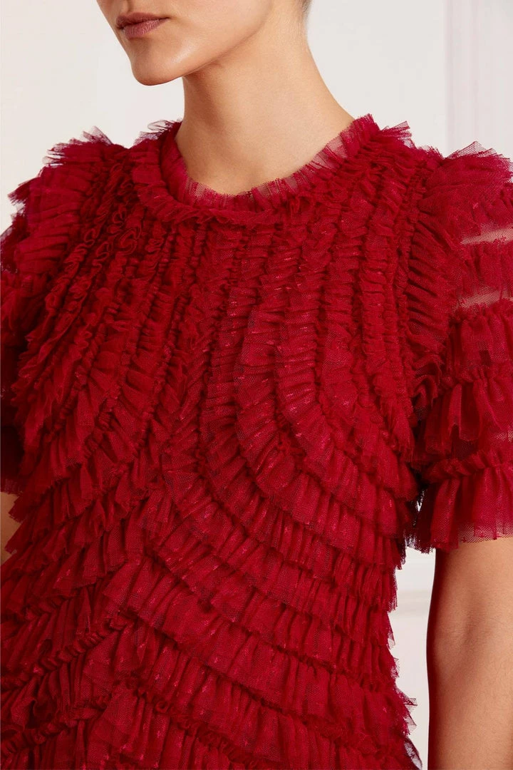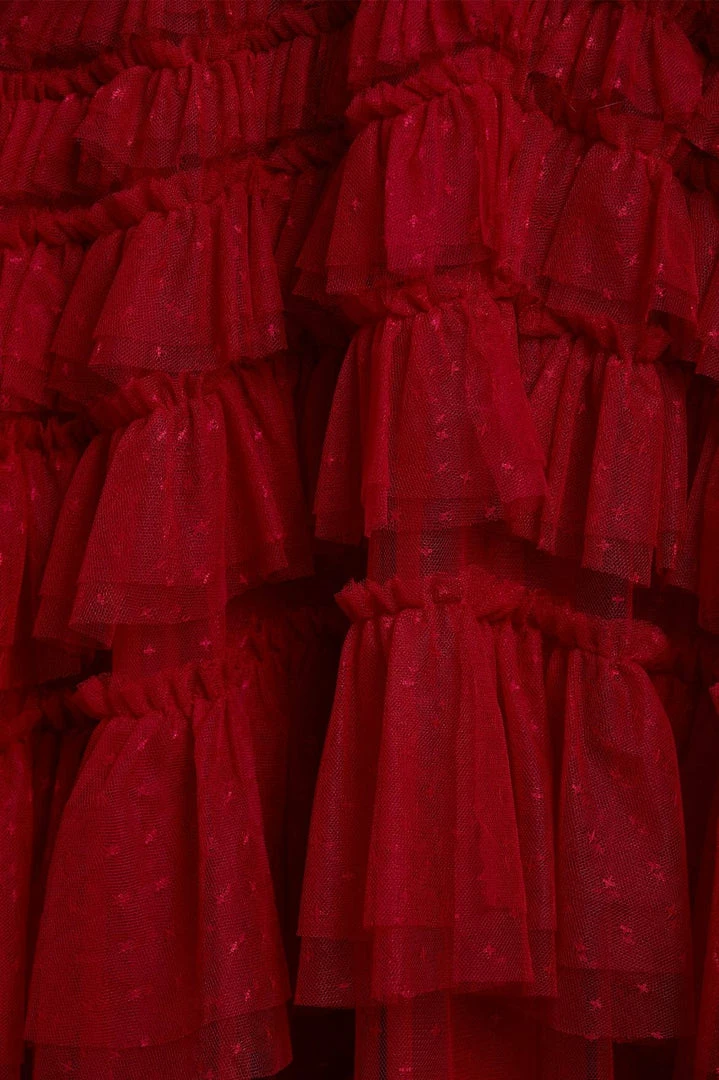 The Willow Ruffle Gown in Deep Red. A Needle & Thread signature shape. This show-stopping gown is adorned with layers of tulle frills engineered to create a flattering texture. Developed from our kisses tulle, featuring an ‘x’ motif throughout. Make a statement in the Willow.