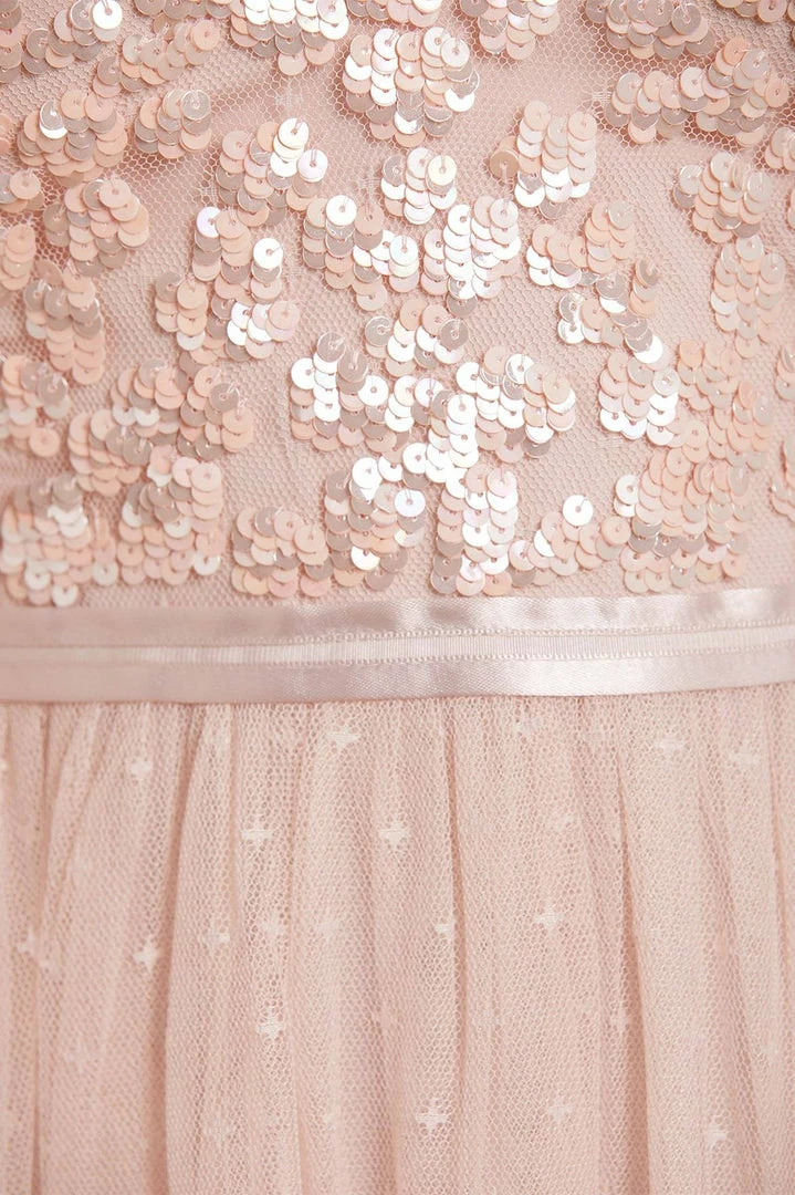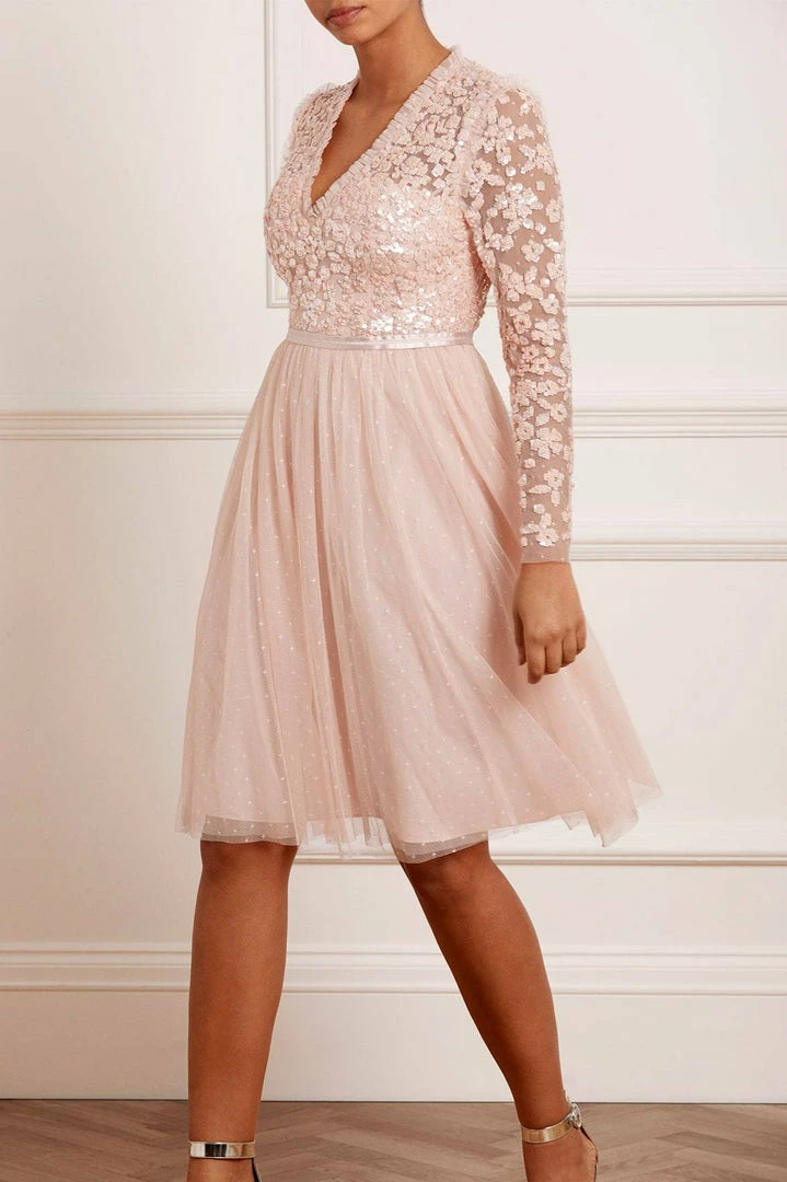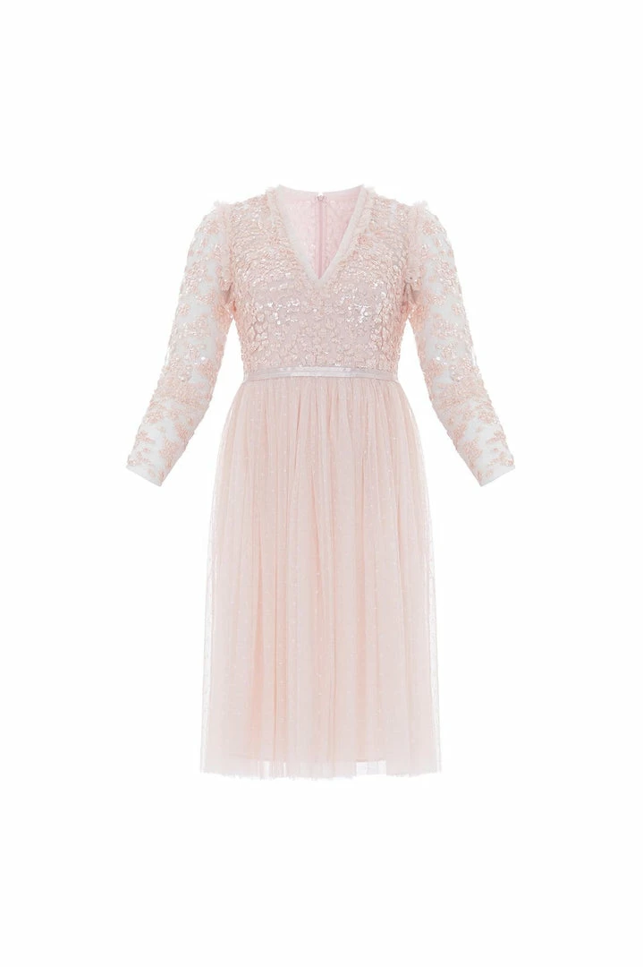 NEEDLE & THREAD EXCLUSIVE. The Amalie Bodice Long Sleeve V-Neck Midi Dress in Petal Pink. Featuring a bodice decorated with intricate shimmering sequins and floral motifs, this long-sleeved, V-neck dress is designed with a layered tulle skirt featuring ‘x’ motifs throughout, adding subtle texture. Make this dress your new season go-to.