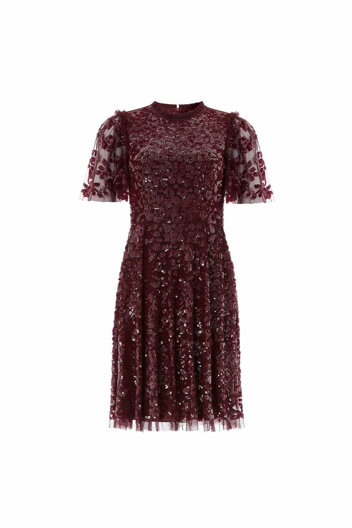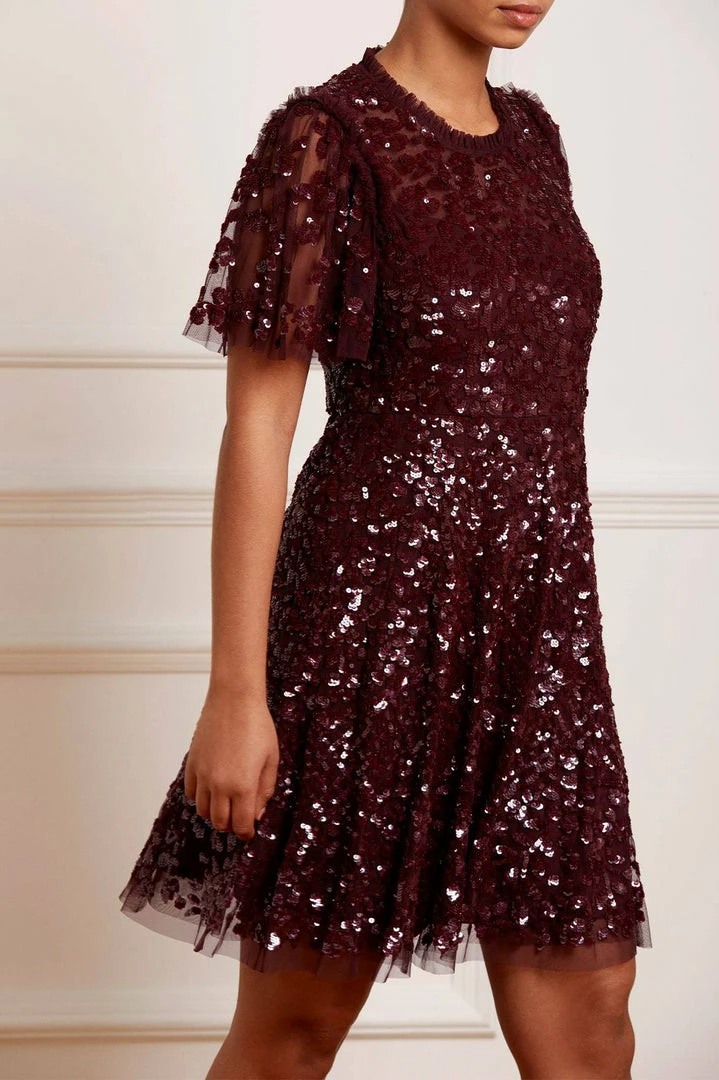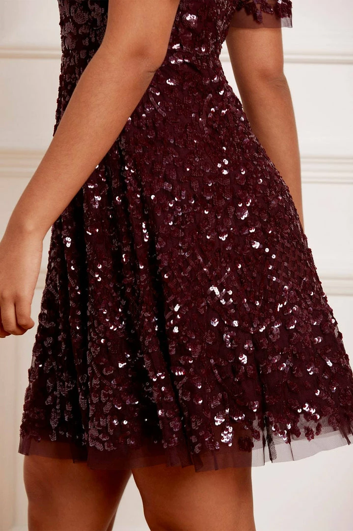 The Amalie Sequin Mini Dress in Burgundy. Decorated with intricate shimmering sequins and floral motifs, this short-sleeved dress is designed with a layered tulle skirt featuring ‘x’ motifs throughout, adding subtle texture. Make this your new season go-to.
