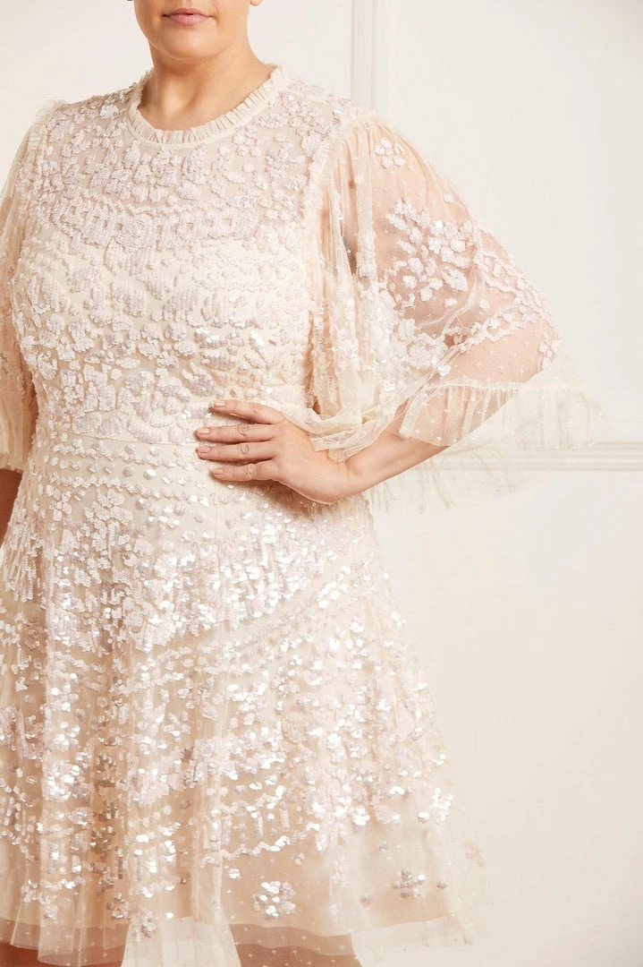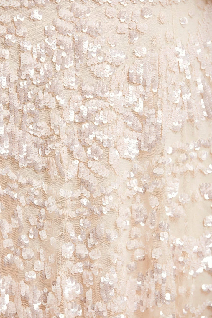 NEEDLE & THREAD EXCLUSIVE | The Anais Sequin Dress in Champagne/ Pink. This dress is beautifully decorated in champagne sequins, developed from a vintage, French hand-drawn lace design. Crafted with lace floral borders throughout and pretty, floaty sleeves. The perfect dress for any occasion.