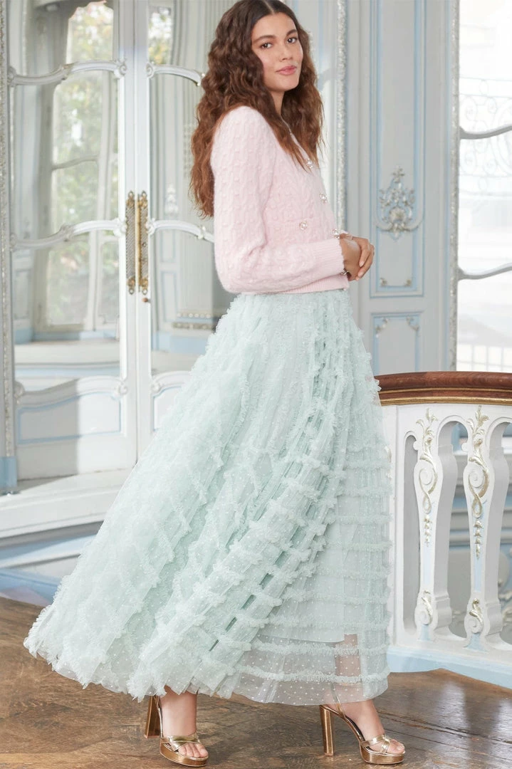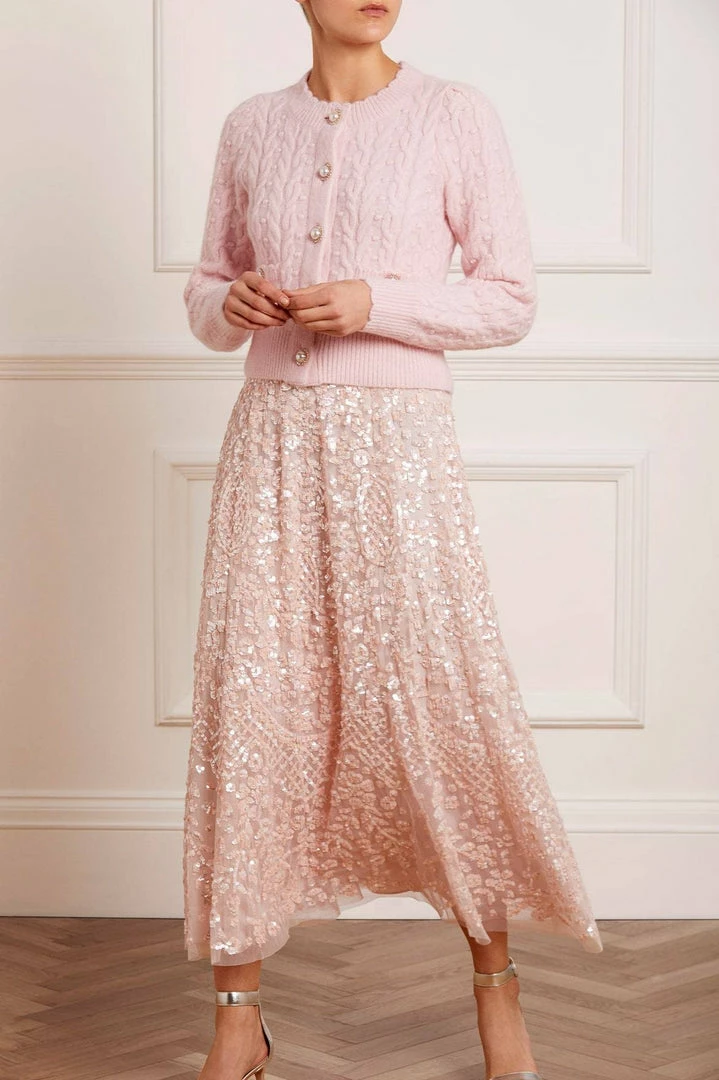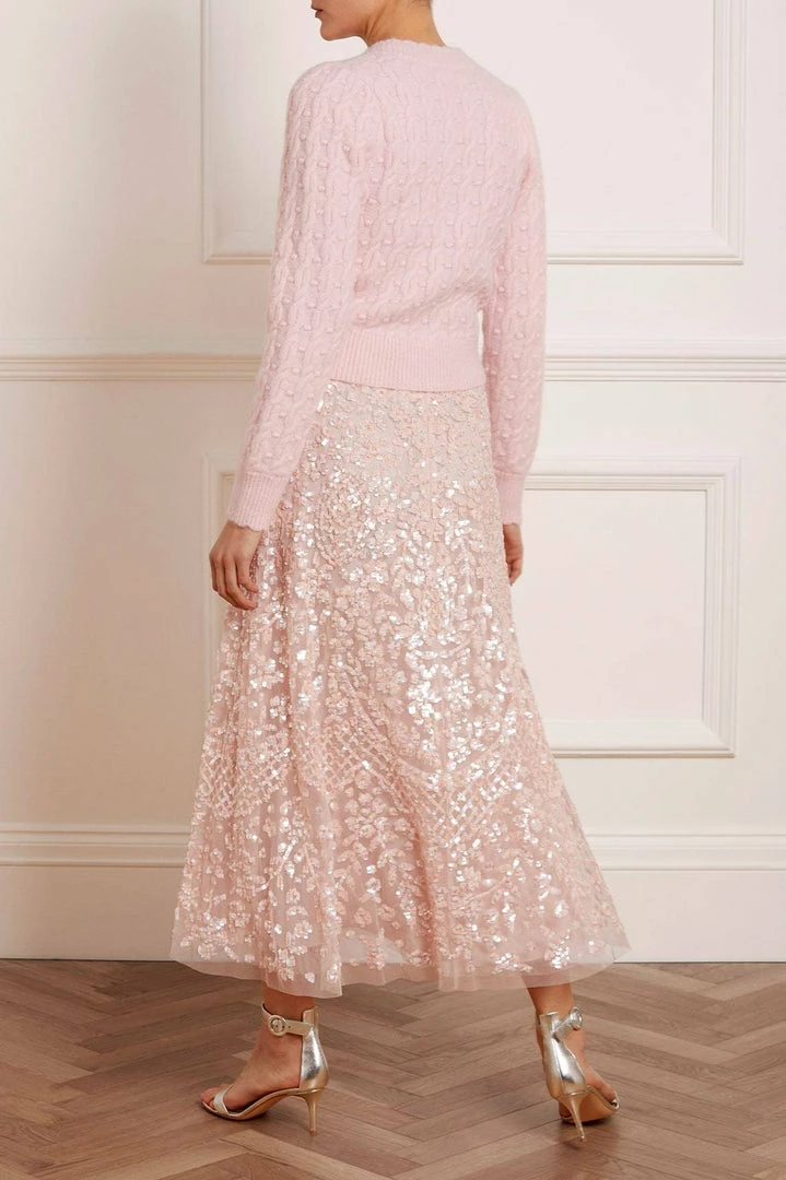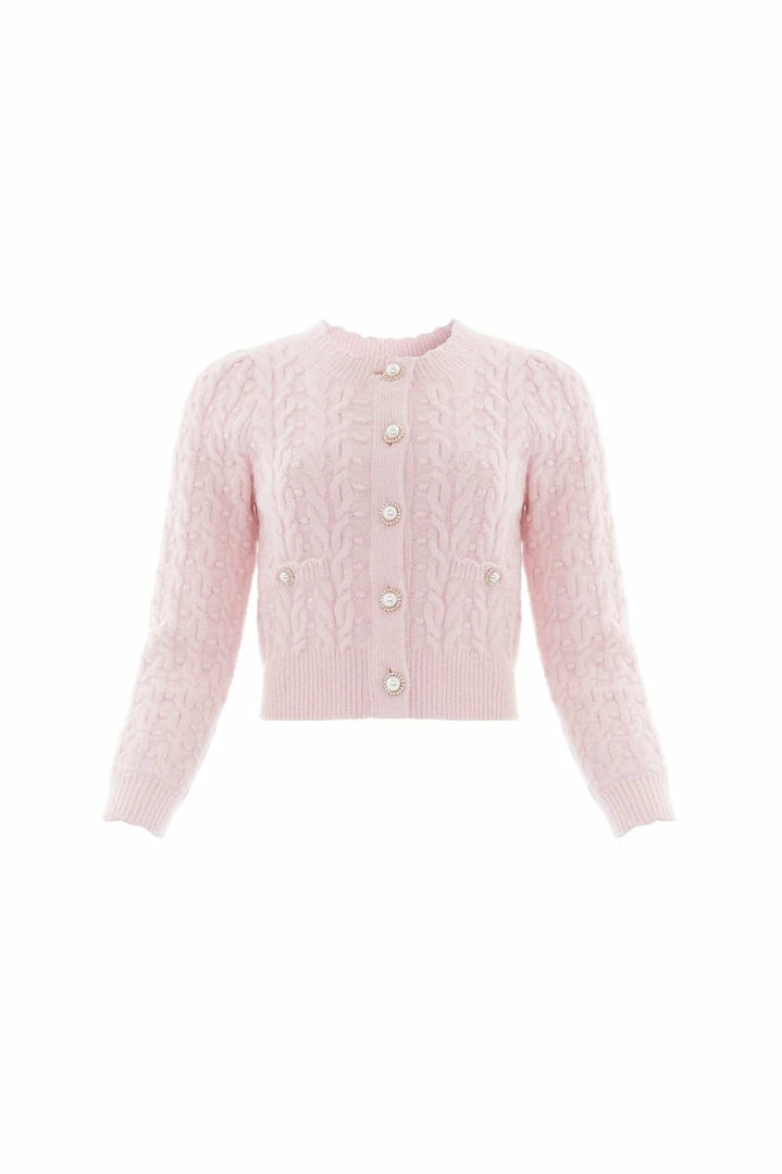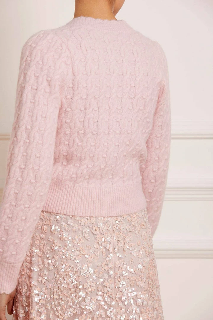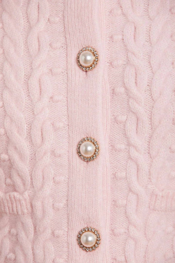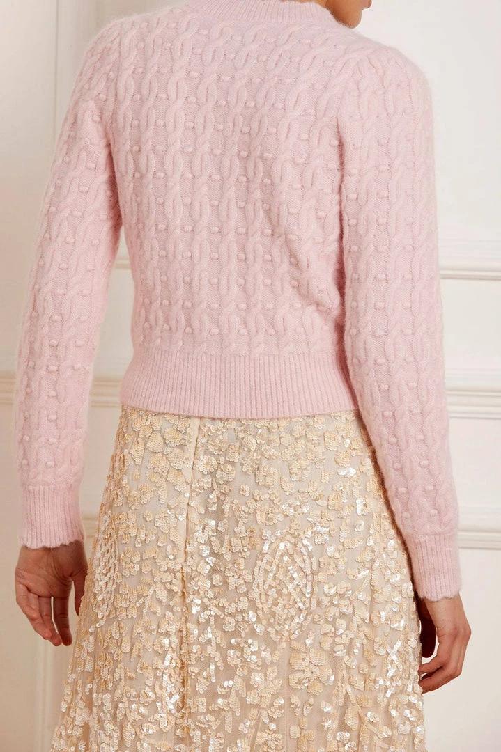 NEEDLE & THREAD EXCLUSIVE. The Cable Bobble Short Cardigan in Petal Pink. This cardigan is crafted from soft alpaca yarn, resulting in a cosy, fluffy texture. Featuring intricate cables and bobbles to create a substantial, deeply tactile knit. Designed with faux pockets, crystal buttons and scallop detailing. Make this style a new wardrobe favourite.