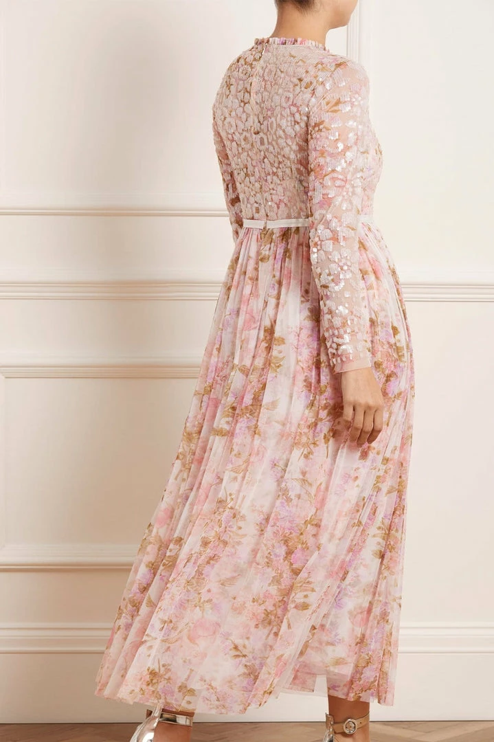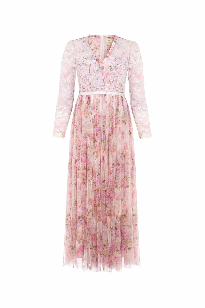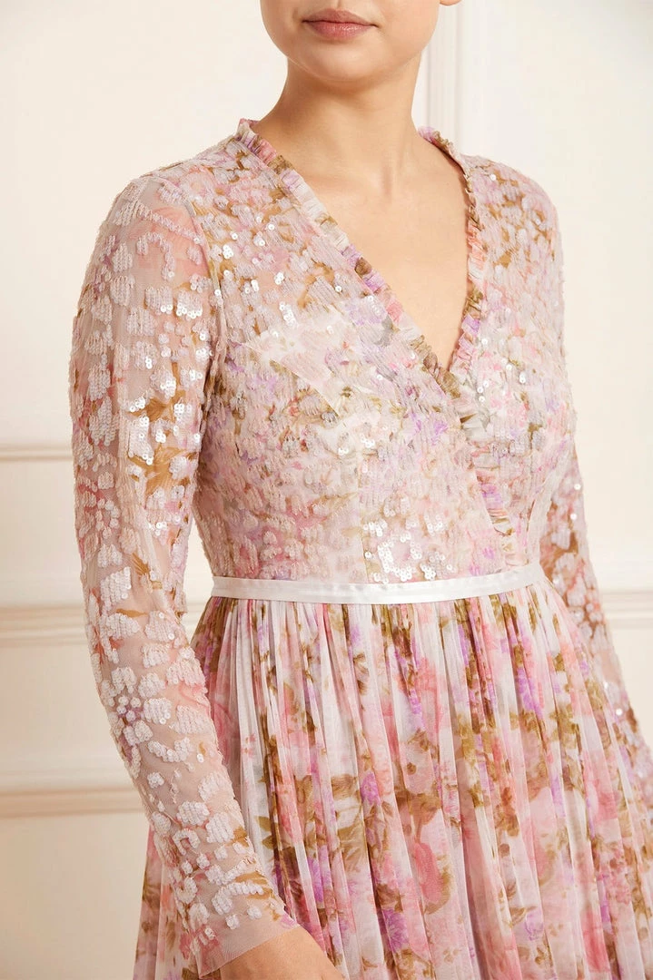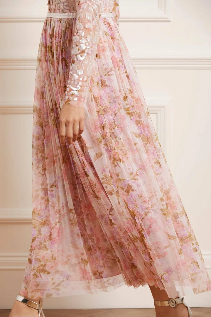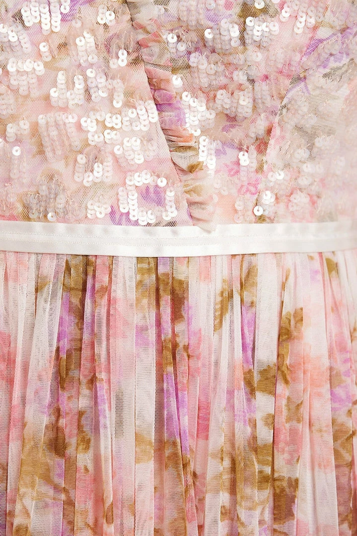 The Darling Meadow V Neck Bodice Ankle Gown in Pink / Multi. This statement gown is beautifully printed with painted flowers and garden motifs, inspired by a vintage French fabric. The bodice is adorned with shimmering, iridescent sequins in romantic floral motifs and features our signature Needle & Thread satin ribbon at the waist. Crafted with layers of tulle creating romantic, delicate movement. The perfect gown for every special occasion.