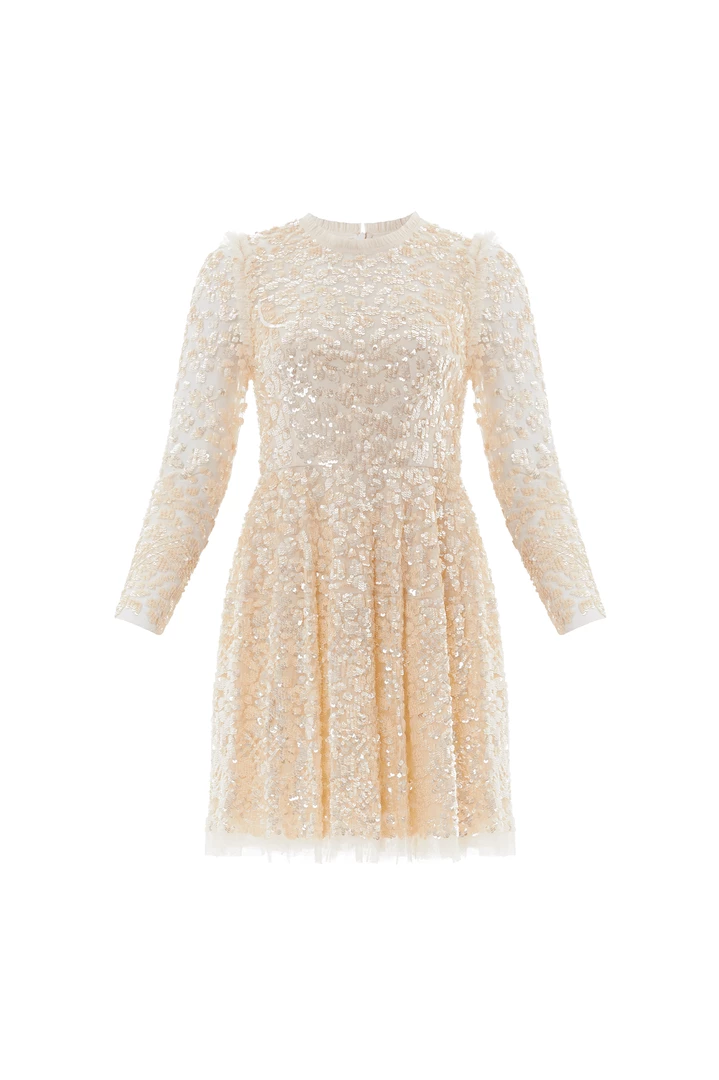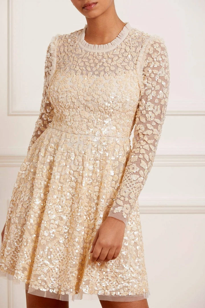NEEDLE & THREAD EXCLUSIVE. The Floral Daze Sequin Micro Mini in Champagne. A beautiful new silhouette for the season ahead. This mini dress is densely decorated with shimmering sequins inspired by a floral lace tablecloth. Exquisitely designed with a layered, soft net to hold this flattering shape. A truly special piece.