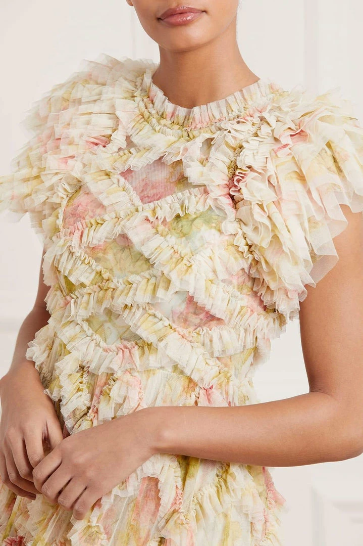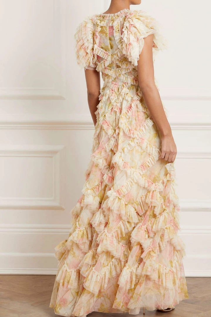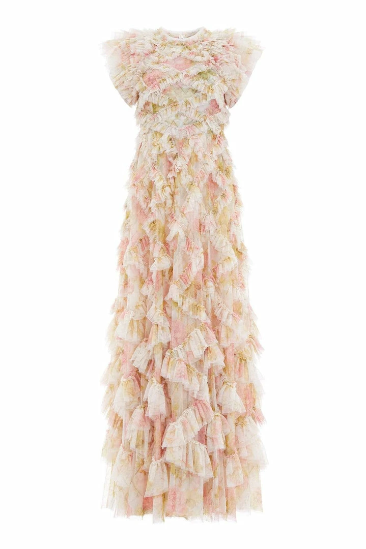The Genevieve Rose Gown in Moonscape. This statement gown is inspired by 1930s Hollywood glamour. Beautifully designed in a harlequin rose print with diamond tulle details. Crafted with multiple layers of ruffled, frothy tulle sculpted for dramatic effect. Make the ultimate style statement of the season.