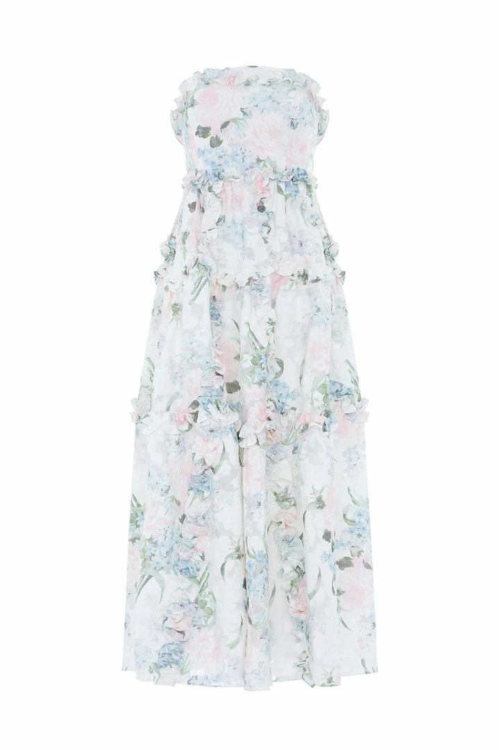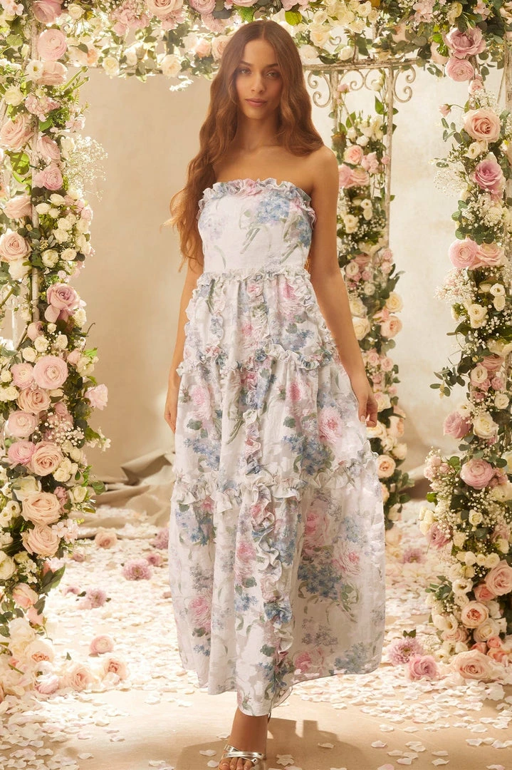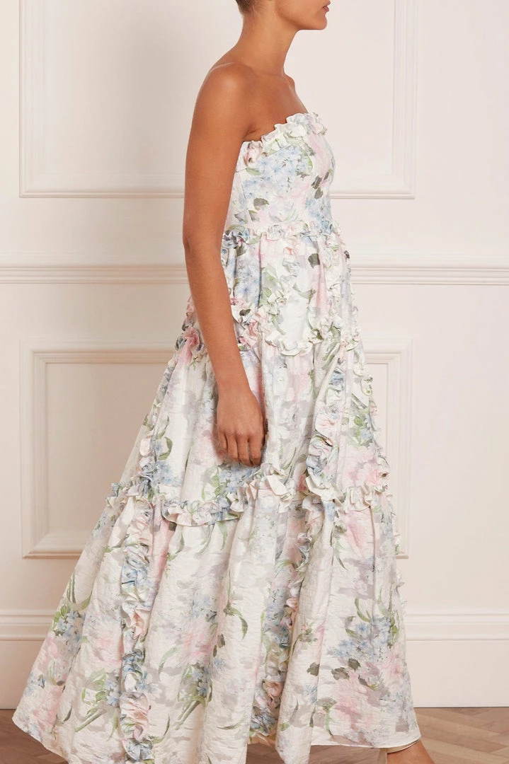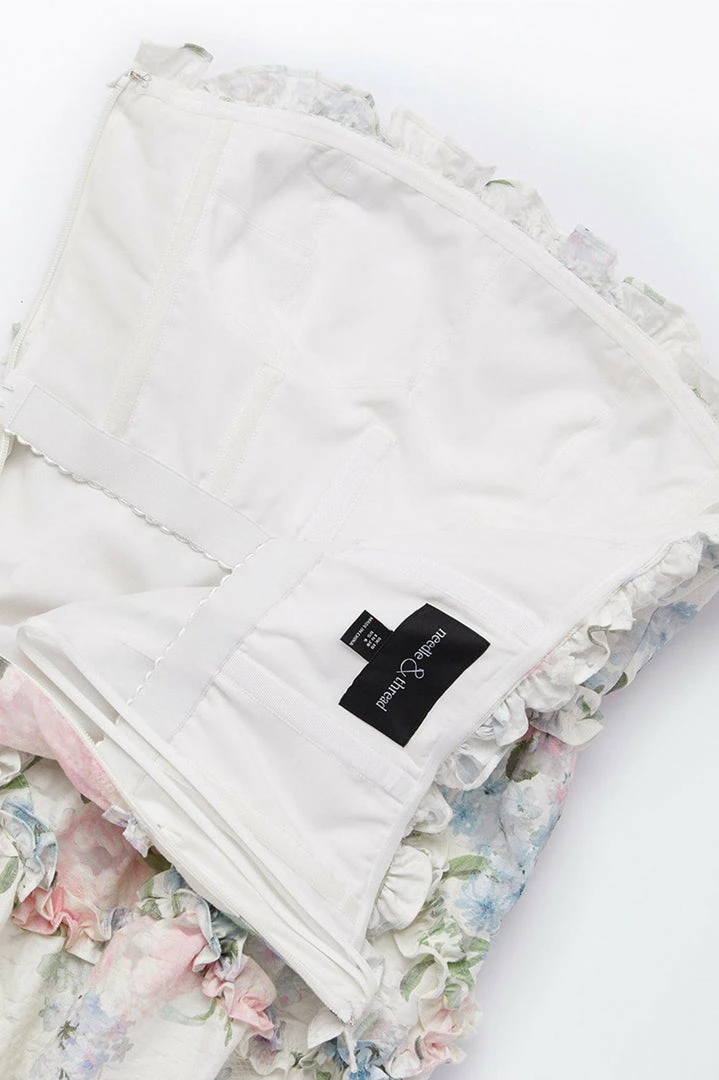 The Posy Blossom Corset Ankle Gown in Moonshine. This corset gown is developed beautifully from jacquard fabric with a romantic floral artwork. Designed with a flattering silhouette featuring a generous skirt, a supportive integrated corset and engineered ruffles throughout. The corset is paneled with a power mesh fabric to hold the silhouette and also allow movement. The perfect gown to take you from day to night.
